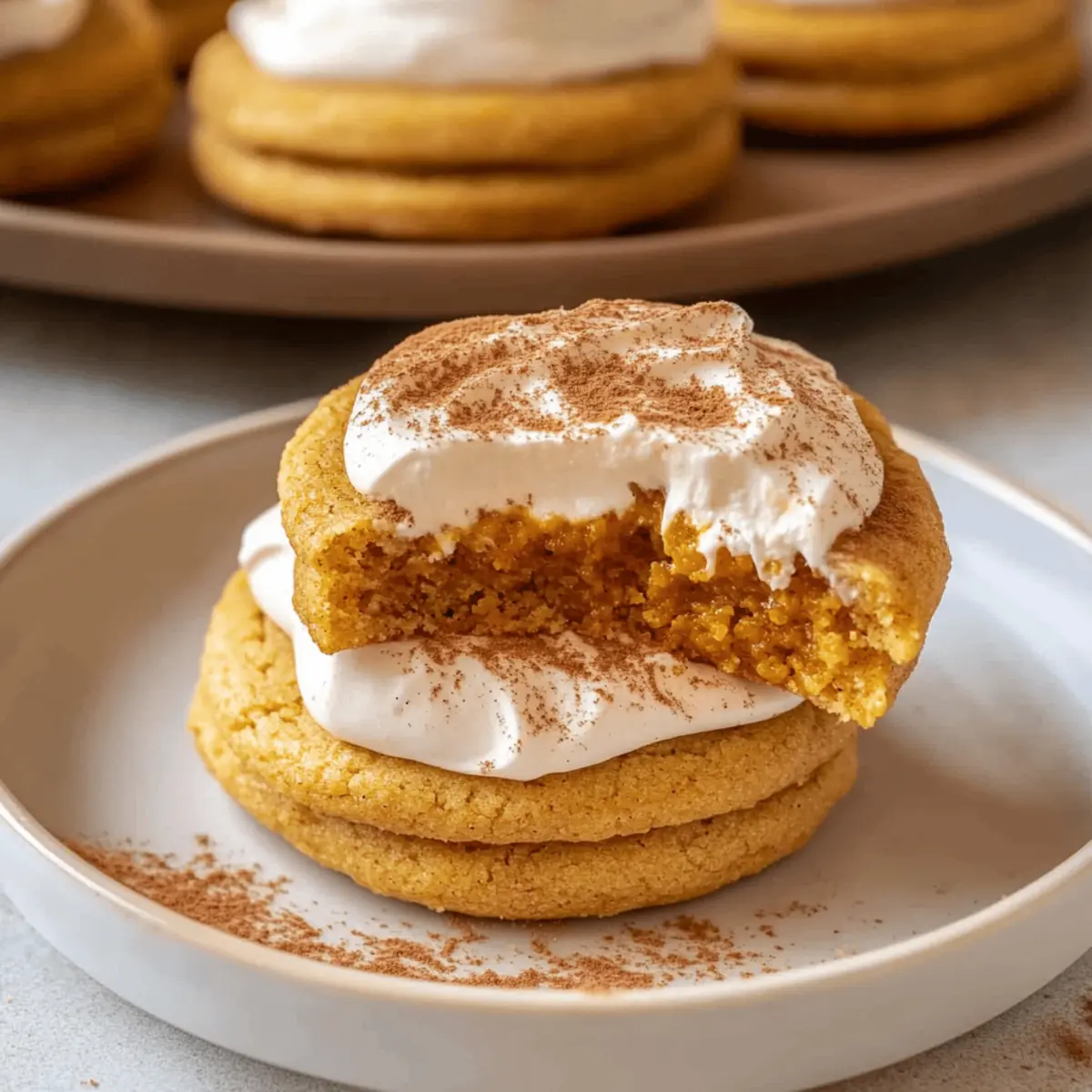 - Spoon or pipe the filling into the cooled cookie wells. Top each with a dollop of whipped cream and sprinkle with cinnamon or nutmeg if desired.