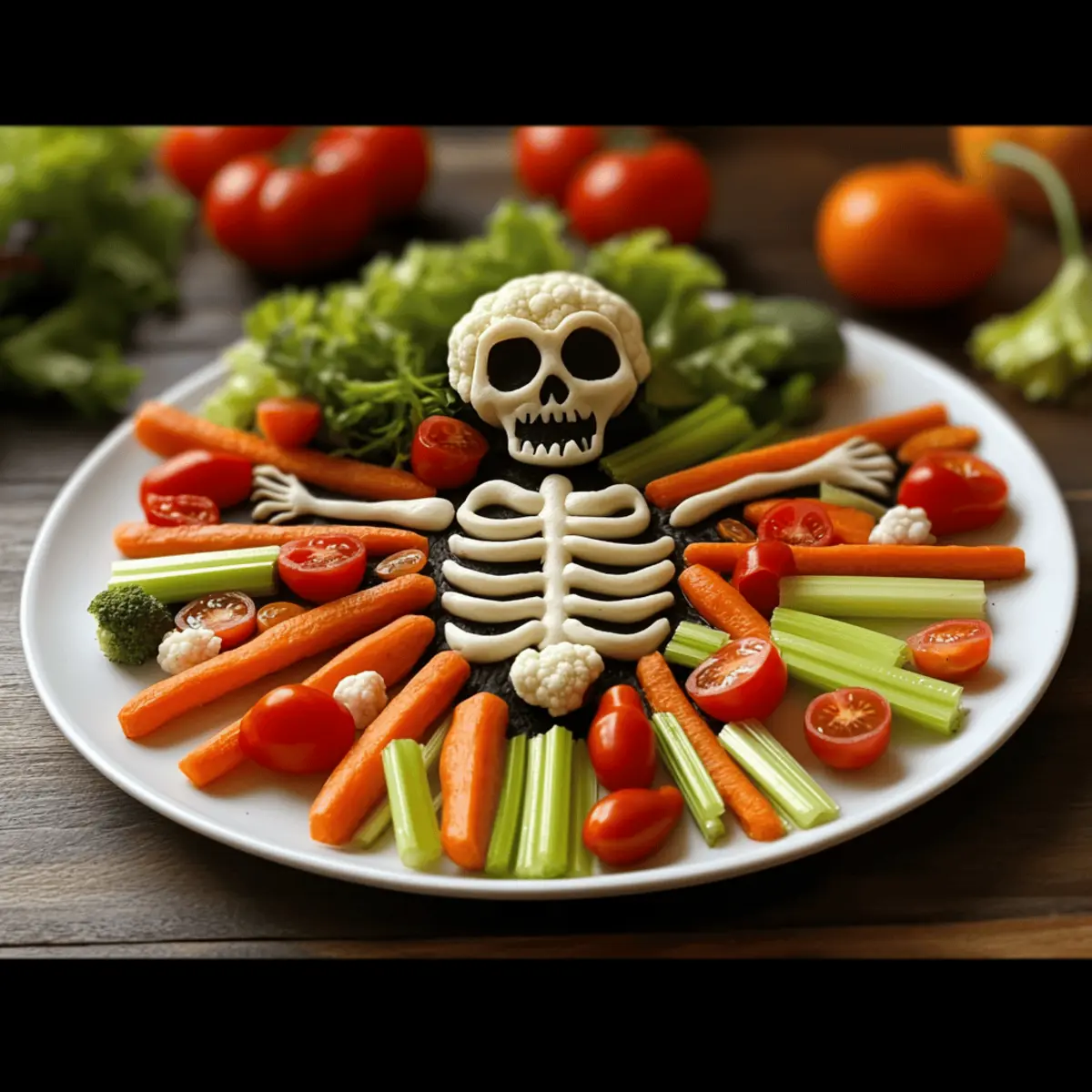 Visual Delight: The Skeleton Veggie Platter is not just a snack; it’s a centerpiece that captivates both kids and adults alike.