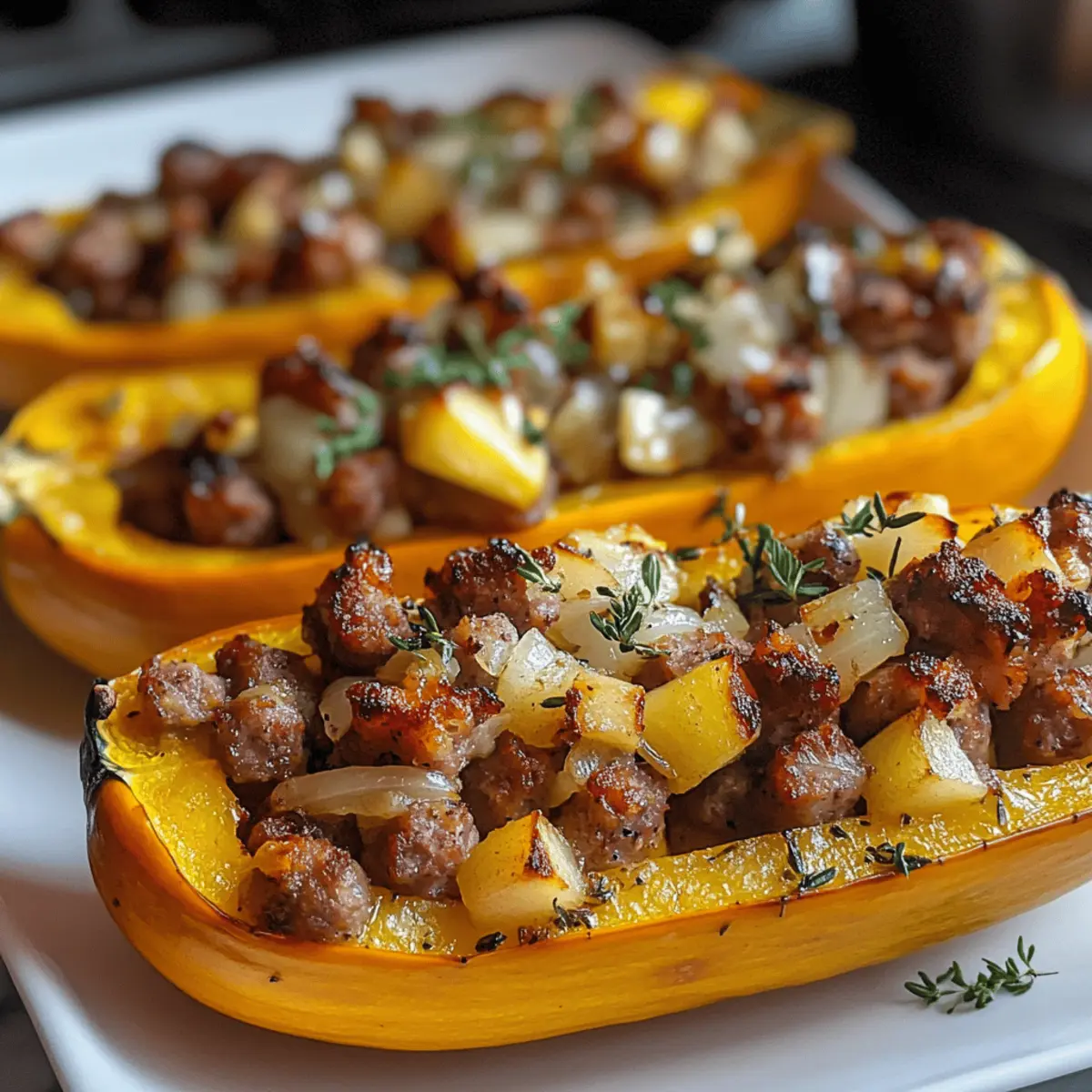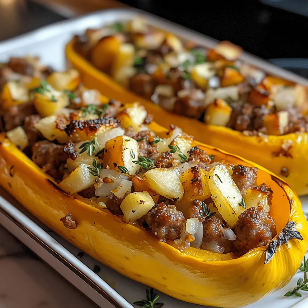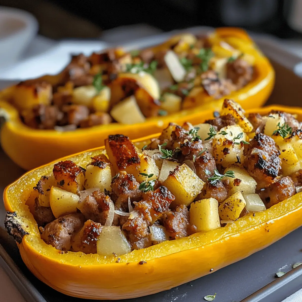 - Fill the roasted squash halves with the sausage-apple mixture, pressing down gently.