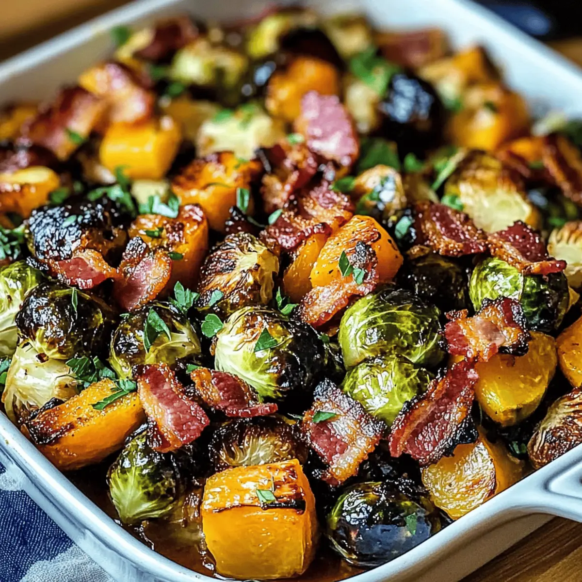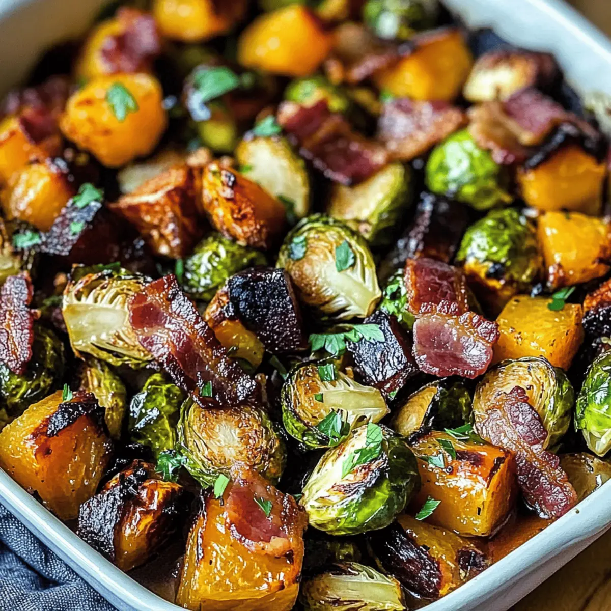 Once caramelized, remove the baking sheet from the oven and let it cool slightly. Garnish the dish with freshly chopped parsley before serving. This finishing touch not only enhances the visual presentation but also adds a hint of freshness to each bite, making your Maple Butternut Brussels Bacon all the more delightful!