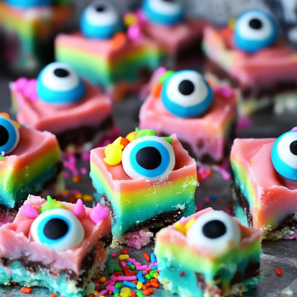 - Sprinkle crushed chocolate cookies, candy eyeballs, and Halloween sprinkles over the top before fudge sets.