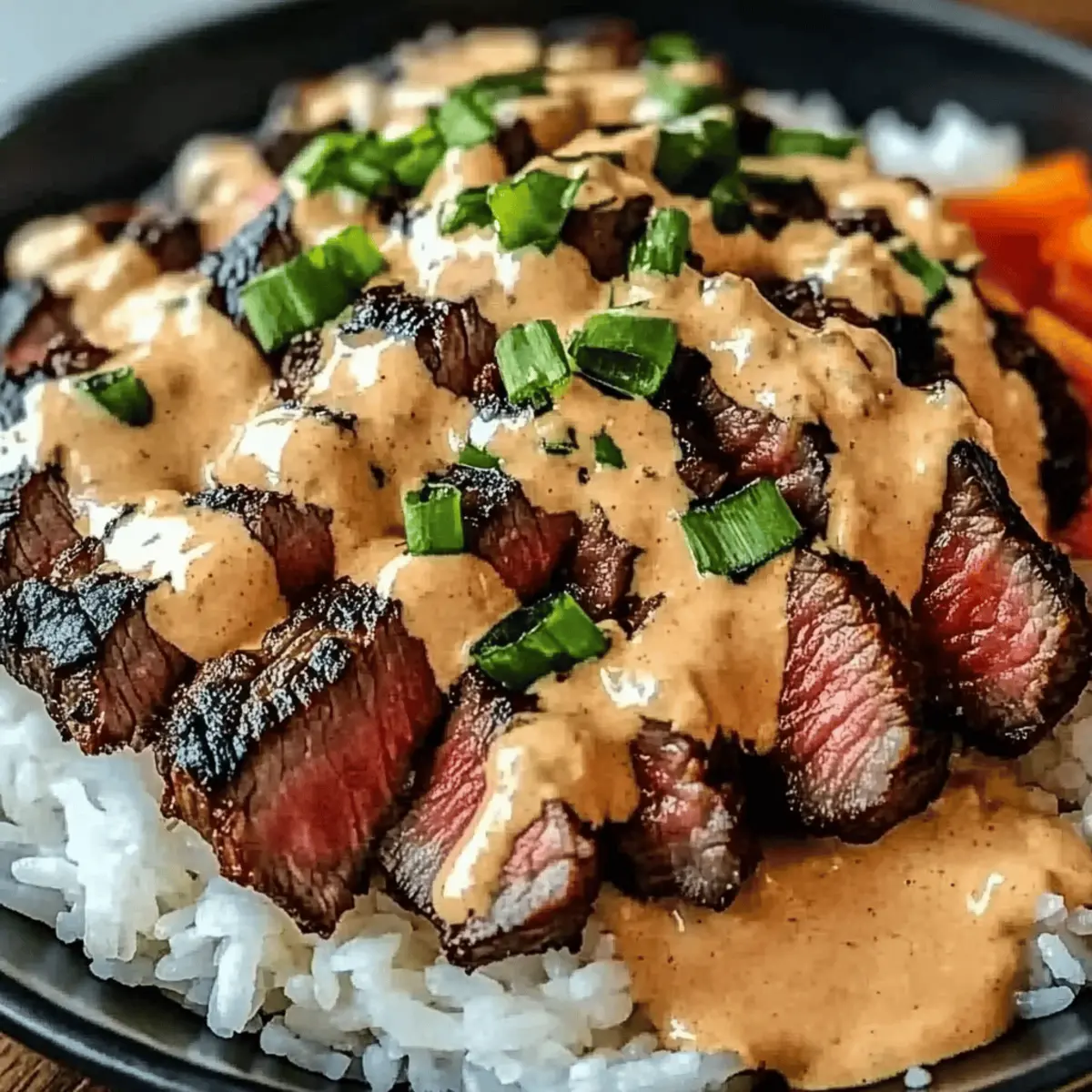 Savor Korean BBQ Steak Rice Bowls with Spicy Cream Sauce