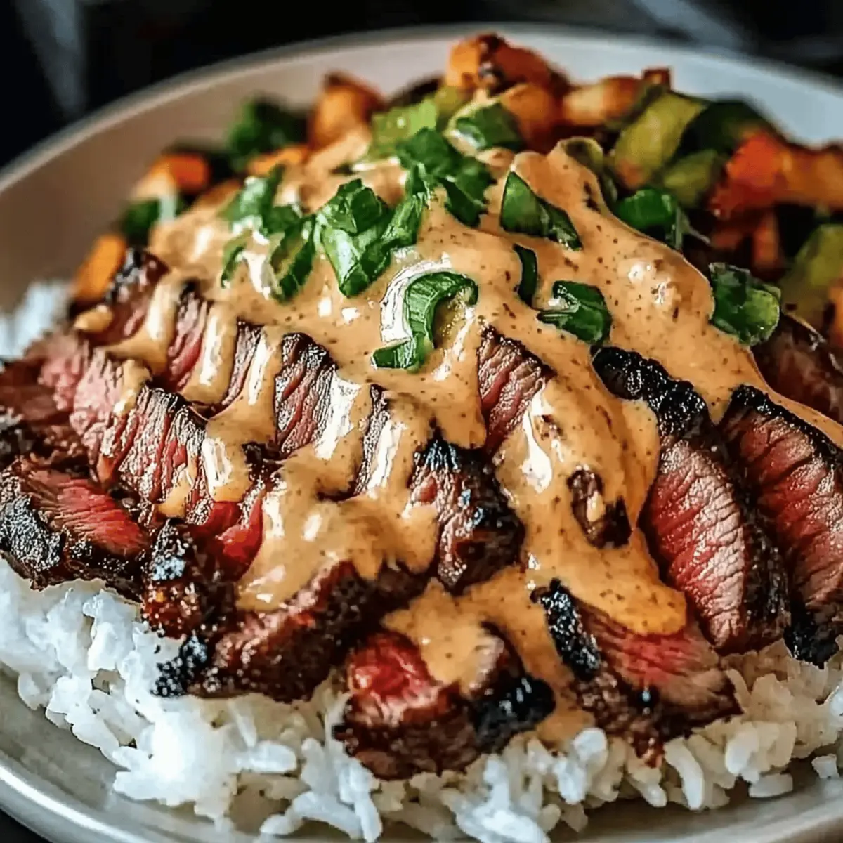 - In serving bowls, layer jasmine rice, sliced steak, and sautéed vegetables. Drizzle with spicy cream sauce.