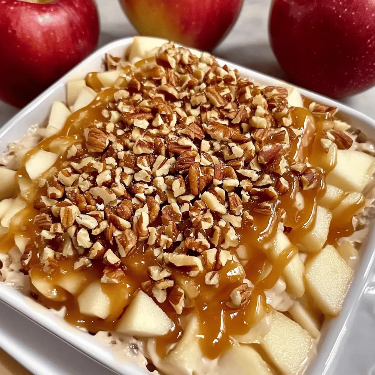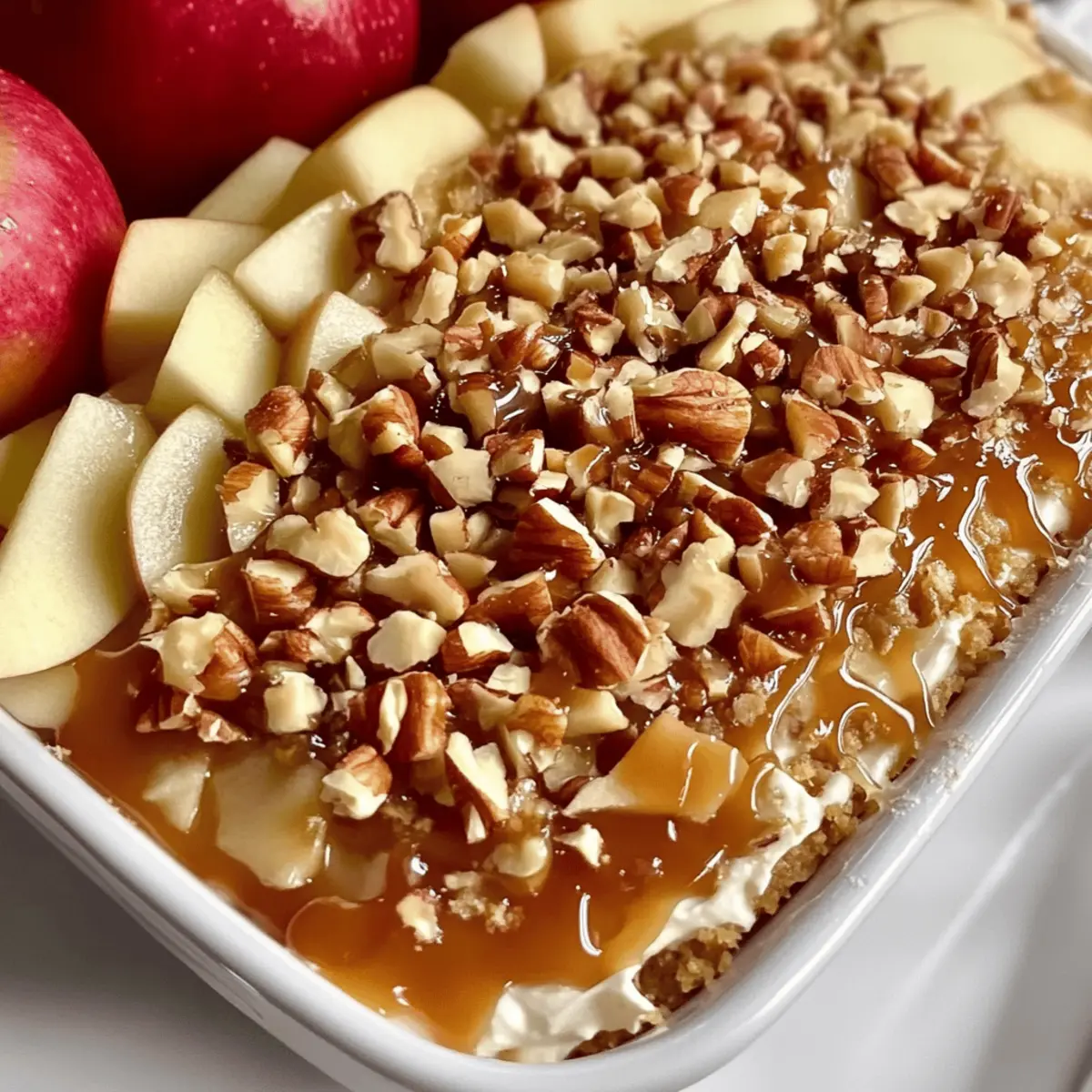 Evenly sprinkle 1–2 diced apples and, if desired, ¼ cup crushed pecans over the caramel layer. The apples bring a refreshing crunch while balancing the dip’s sweetness, and the pecans add an appealing crunch. This step enhances the visual appeal and flavors of the dip, making it even more tempting for guests.