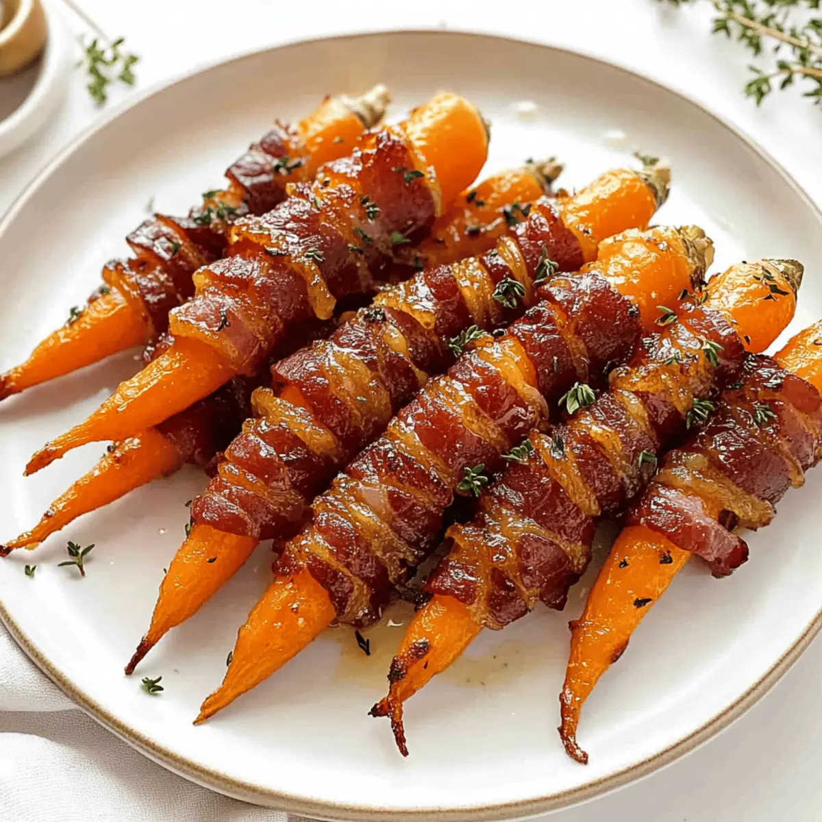 Wash and peel the whole carrots, ensuring they are clean and ready for wrapping. Cut each carrot into uniform lengths to promote even cooking. Once prepared, take a slice of thin cut bacon and tightly wrap it around each carrot, covering as much surface as possible for optimal flavor.