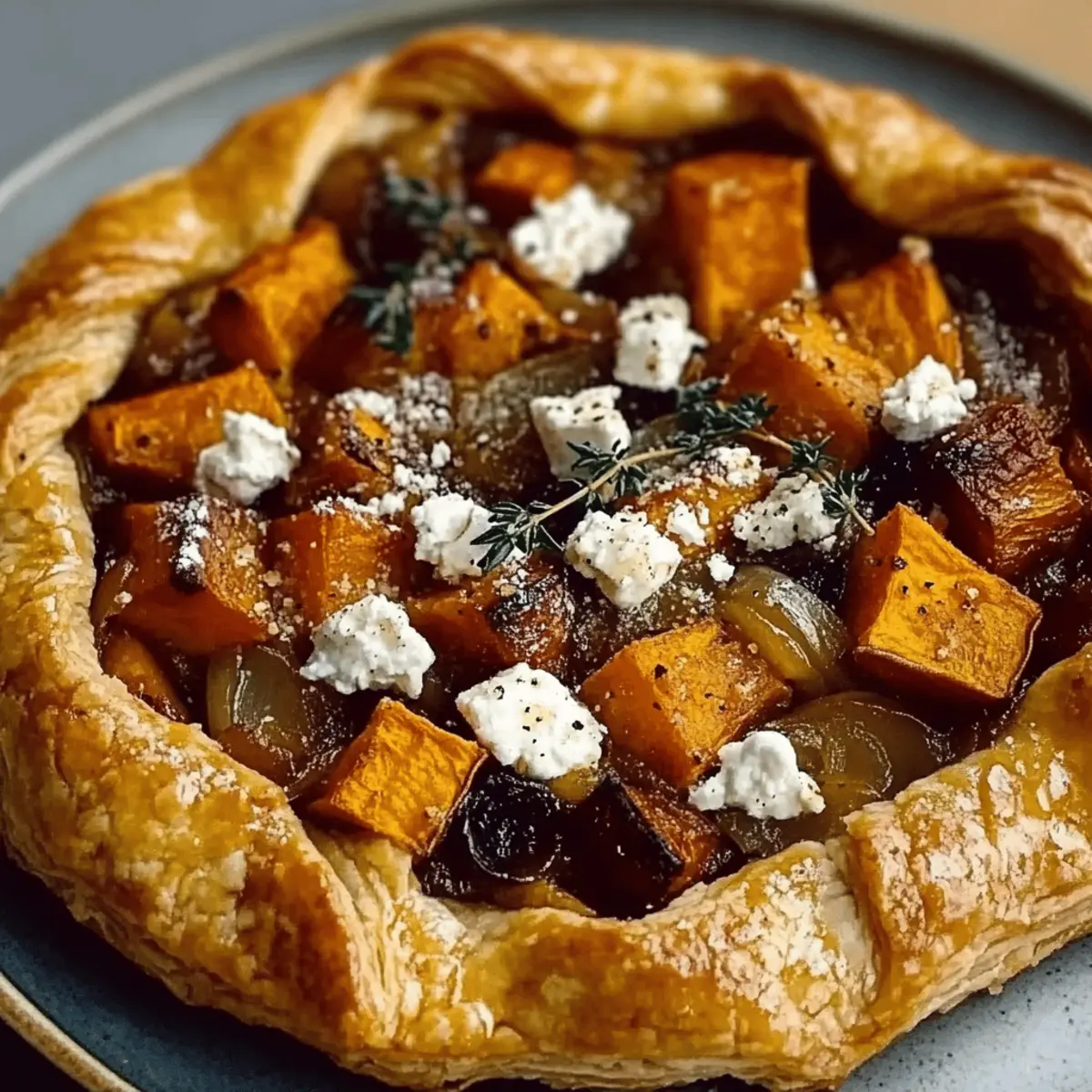 - Spread caramelized onions evenly over the pastry. Layer roasted sweet potatoes on top, followed by crumbled feta cheese and sprinkles of fresh thyme.