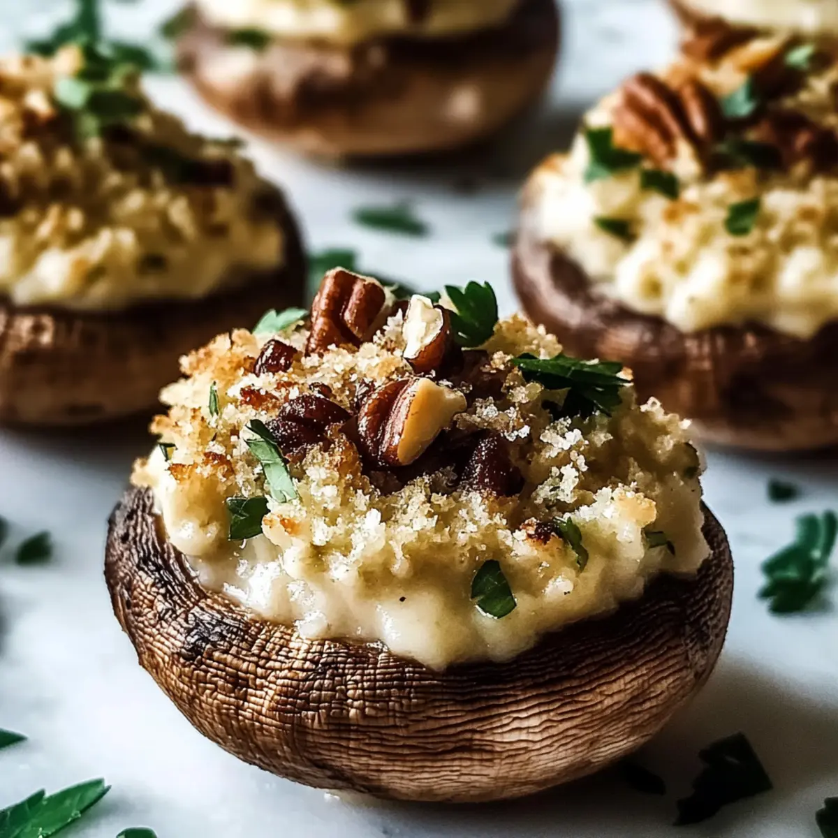 Sprinkle the tops of the stuffed mushrooms with the reserved Parmesan cheese and additional chopped pecans. This topping will create a glorious, crispy layer as the Christmas Stuffed Mushrooms bake, adding texture and flavor to each bite.