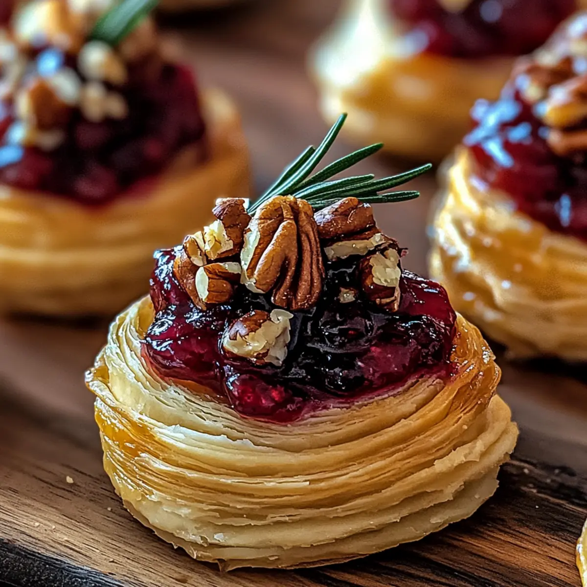 These Baked Cranberry Brie Bites are perfect for meal prep, making your life easier during busy holiday gatherings! You can prepare the pastry cups filled with brie and cranberry sauce up to 24 hours in advance by refrigerating them before baking. Simply place the formed muffin tin in the fridge, covered loosely with plastic wrap, to keep the pastry firm. When you’re ready to bake, preheat your oven and pop them in straight from the fridge, adding a few extra minutes if needed to achieve that golden brown perfection. Allow them to cool slightly before garnishing with rosemary, and enjoy these stunning bites just as delicious as when freshly made!
