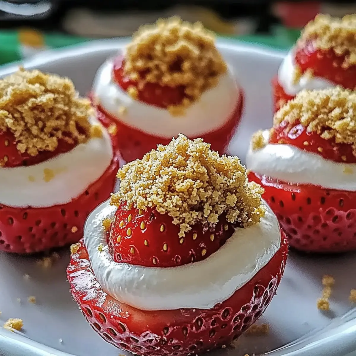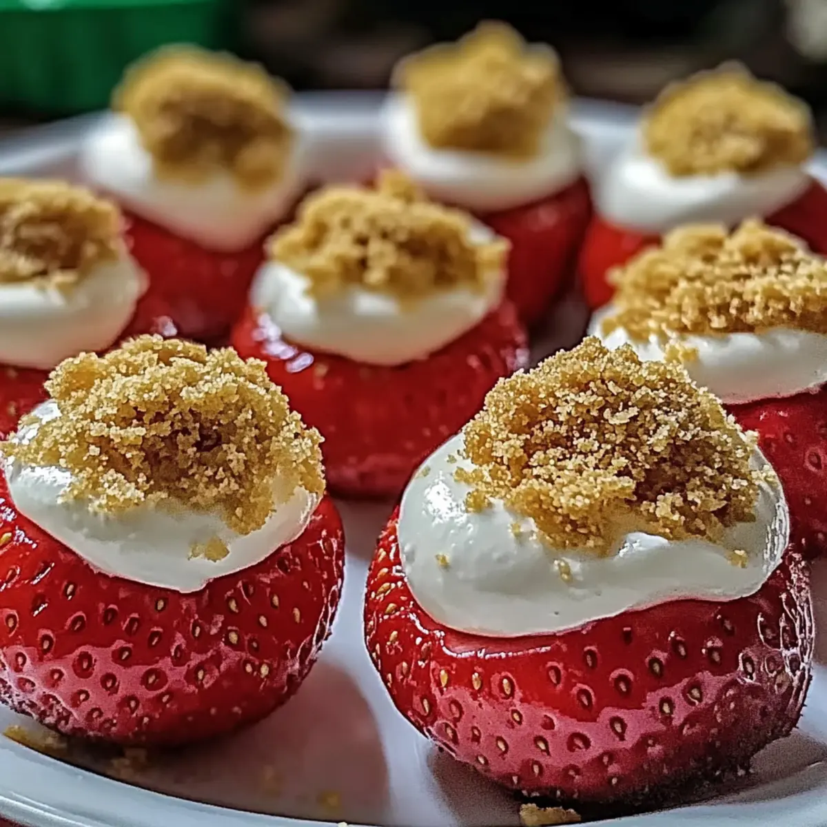 Once all strawberries are filled, sprinkle graham cracker crumbs generously over the cream cheese filling of each berry for that signature crunch. For a personalized touch, you may consider drizzling melted chocolate or adding chopped nuts on top. Feel free to get creative—these customizations will enhance the visual appeal of your Cheesecake Strawberries.