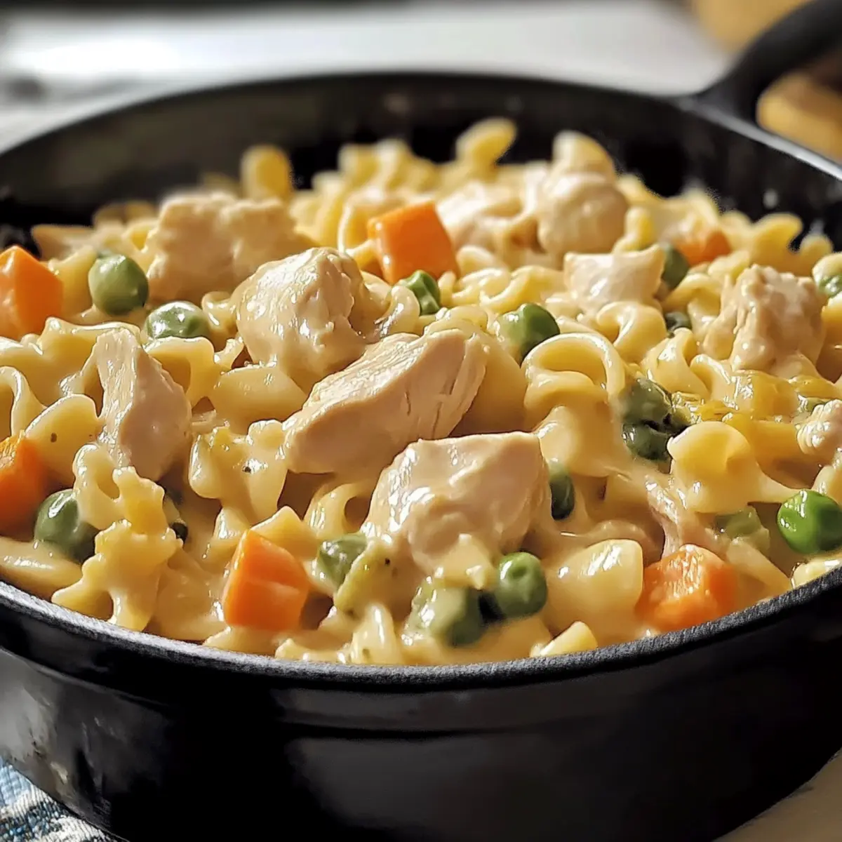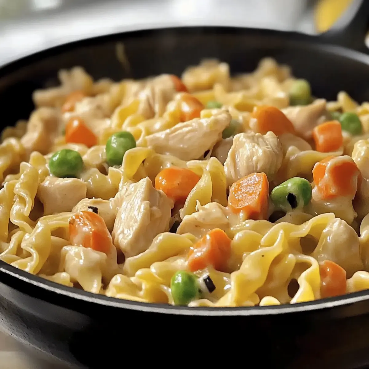 Add the cooked egg noodles into the skillet, carefully folding them into the sauce mixture. Ensure that each noodle is evenly coated with the creamy sauce, and cook for an additional minute to heat everything through. This step brings it all together—creating a luscious, comforting Chicken Pot Pie Pasta.