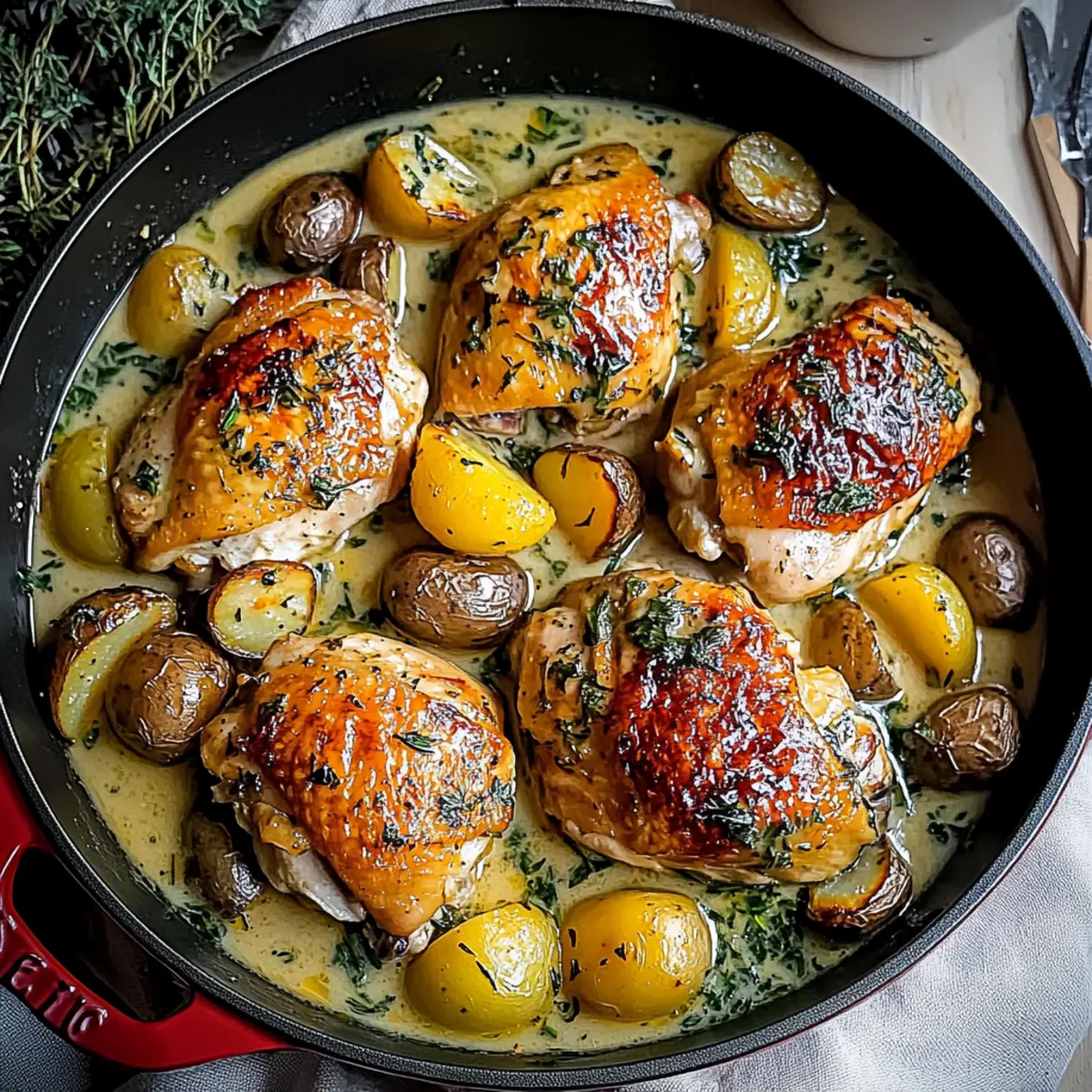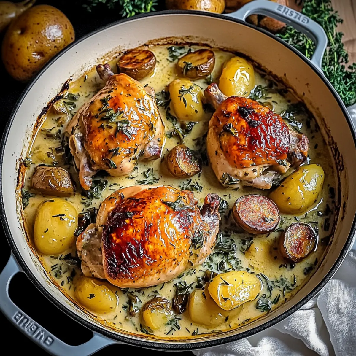 Add halved baby potatoes to the pot, then nestle the browned chicken pieces on top, skin-side up. Cover the Dutch oven and roast in your preheated oven for 40 to 45 minutes. The chicken is done when its internal temperature reaches 165°F (74°C) and the skin is crispy and golden, revealing a comforting meal.