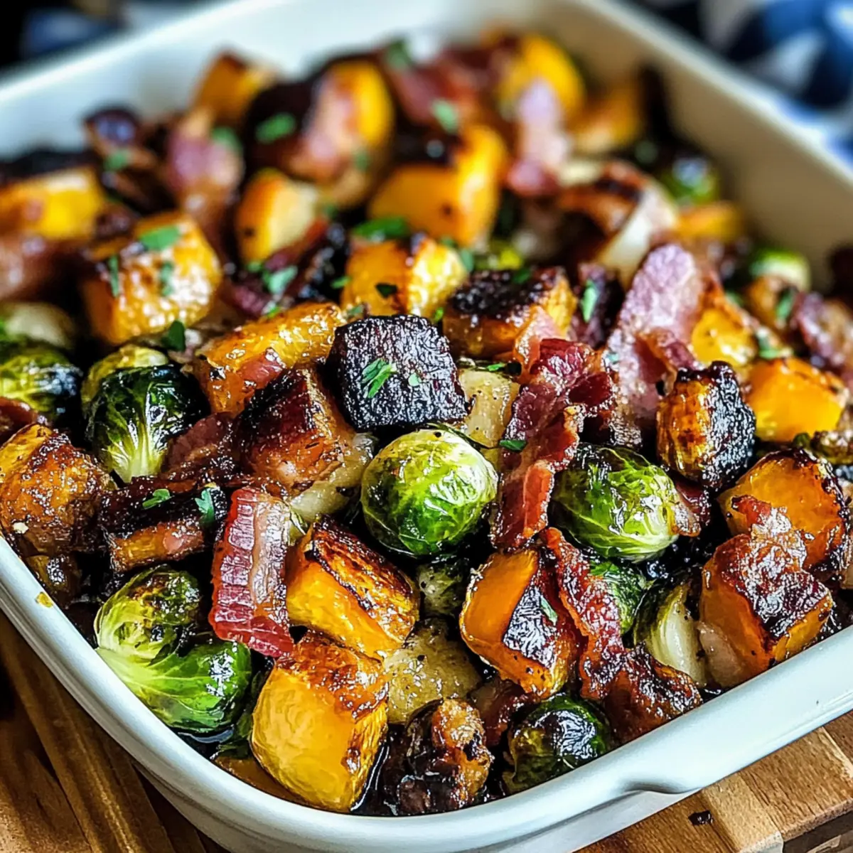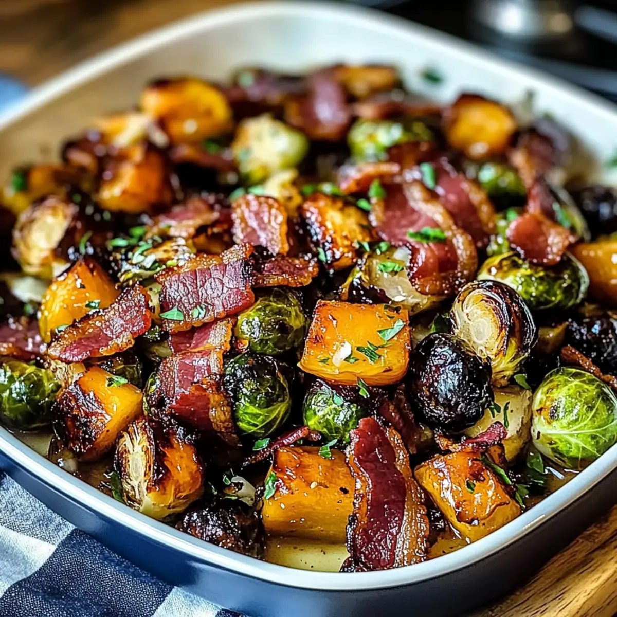 This Maple Butternut Brussels Bacon recipe combines sweet maple syrup and savory bacon for a perfect side dish.