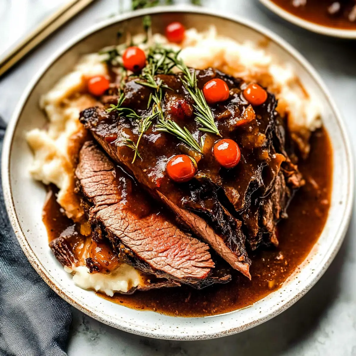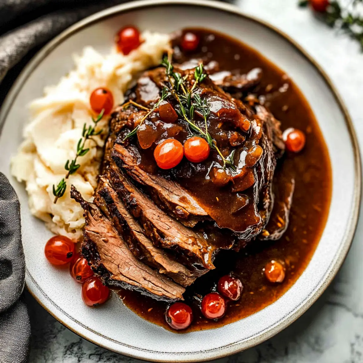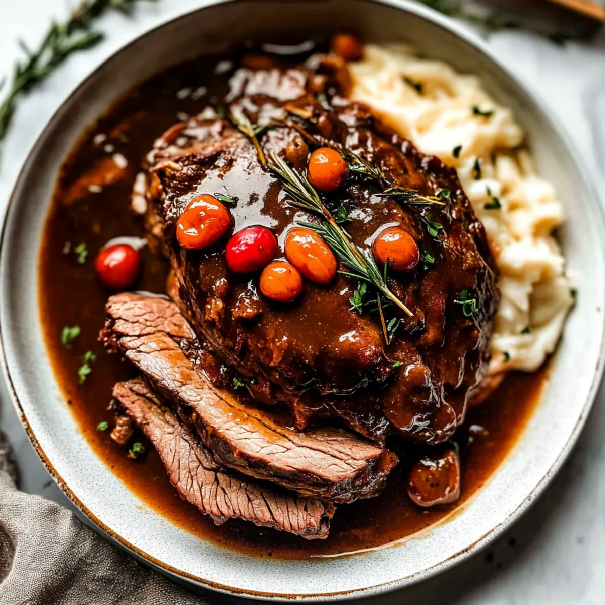 - Taste and adjust the seasoning, remove bay leaf, and serve gravy over sliced roast garnished with fresh herbs and berries.