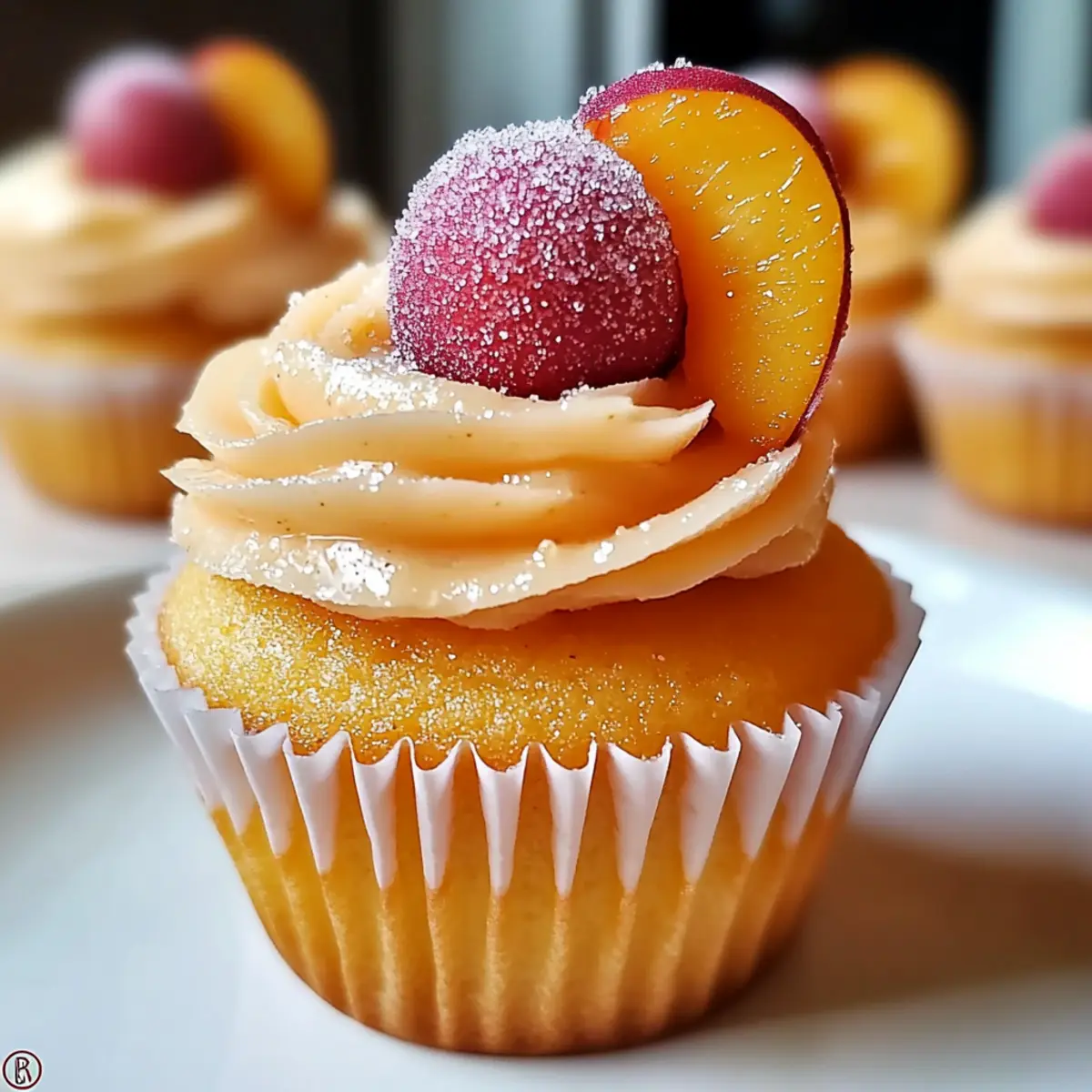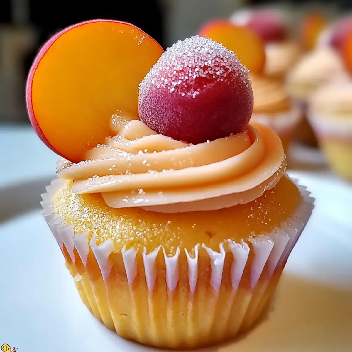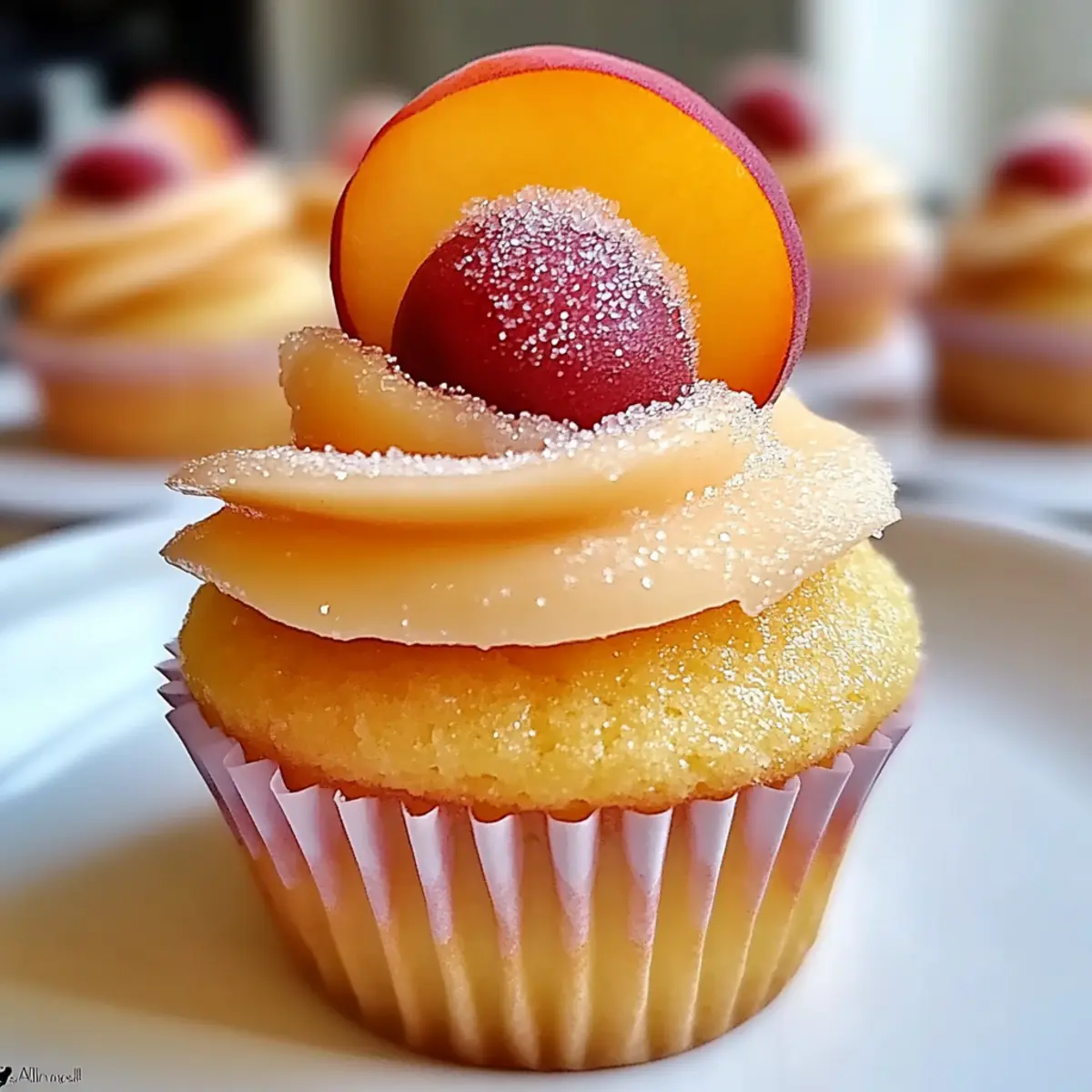 - Garnish each cupcake with a fresh slice of peach and sparkling sugar.