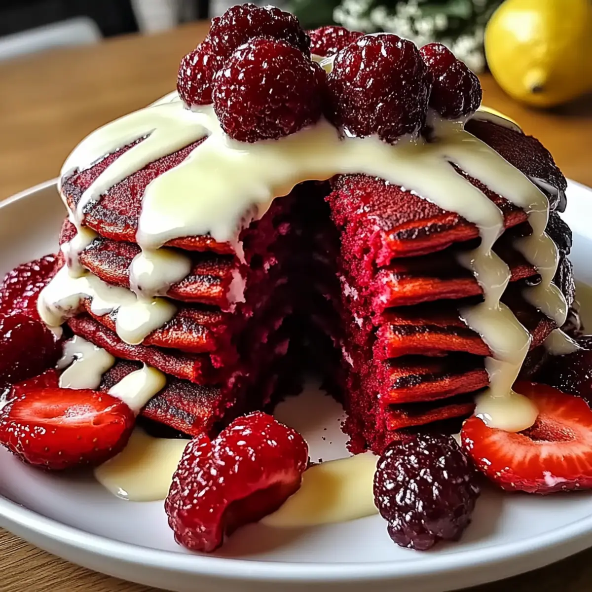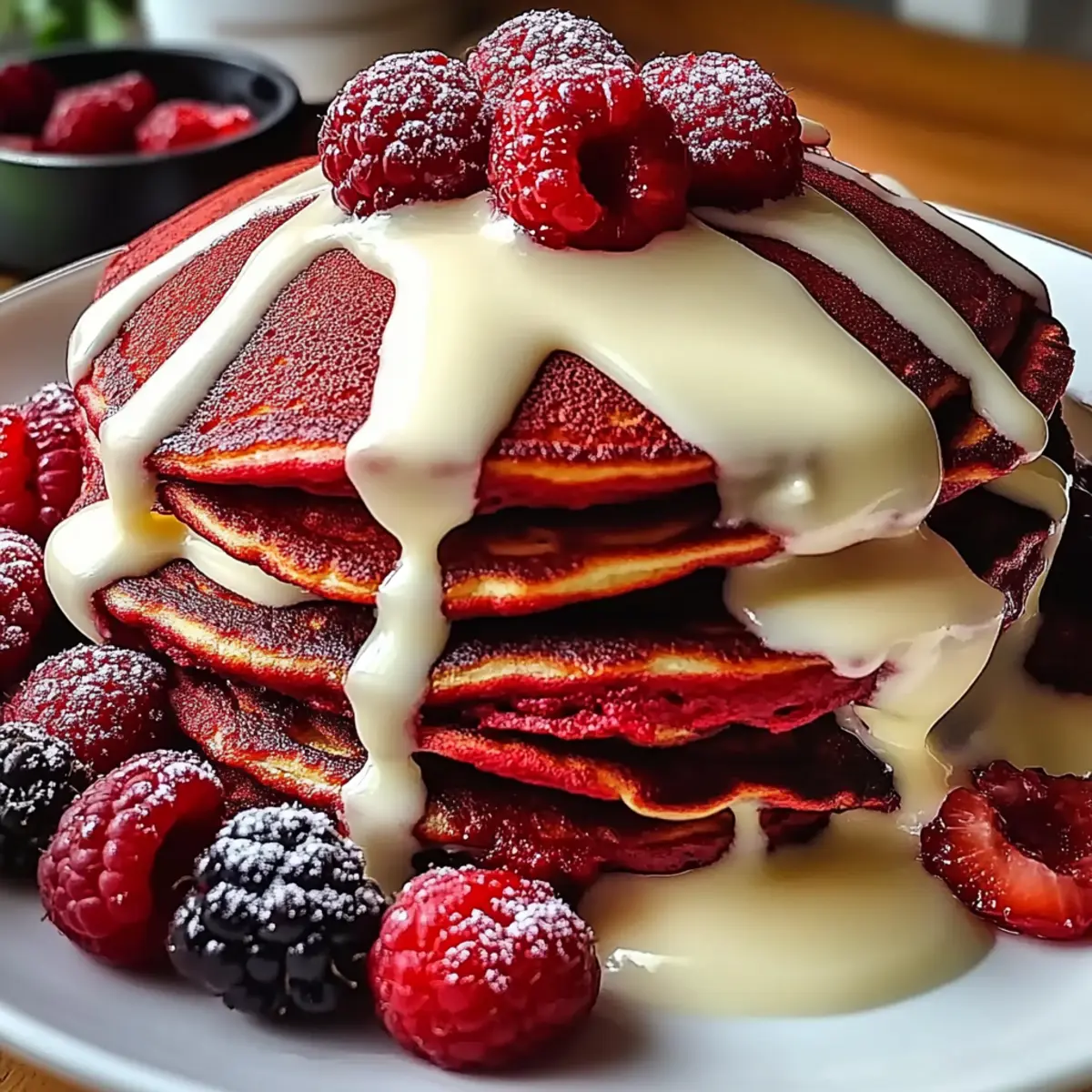 Heap the fluffy Red Velvet Pancakes onto individual plates, generously drizzling the prepared cream cheese glaze over the top. For an extra touch of indulgence, consider garnishing your pancakes with fresh berries or white chocolate shavings to elevate this delightful dish even further!