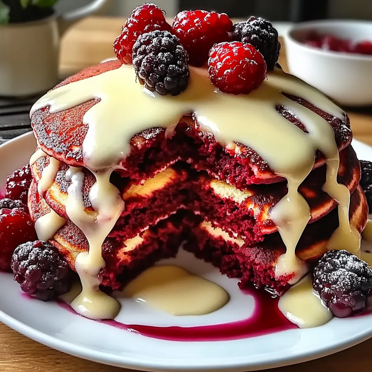 Indulge in Red Velvet Pancakes with a luscious cream cheese glaze for a festive breakfast treat.