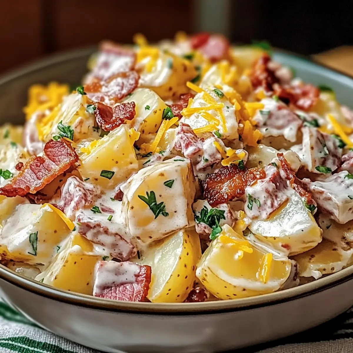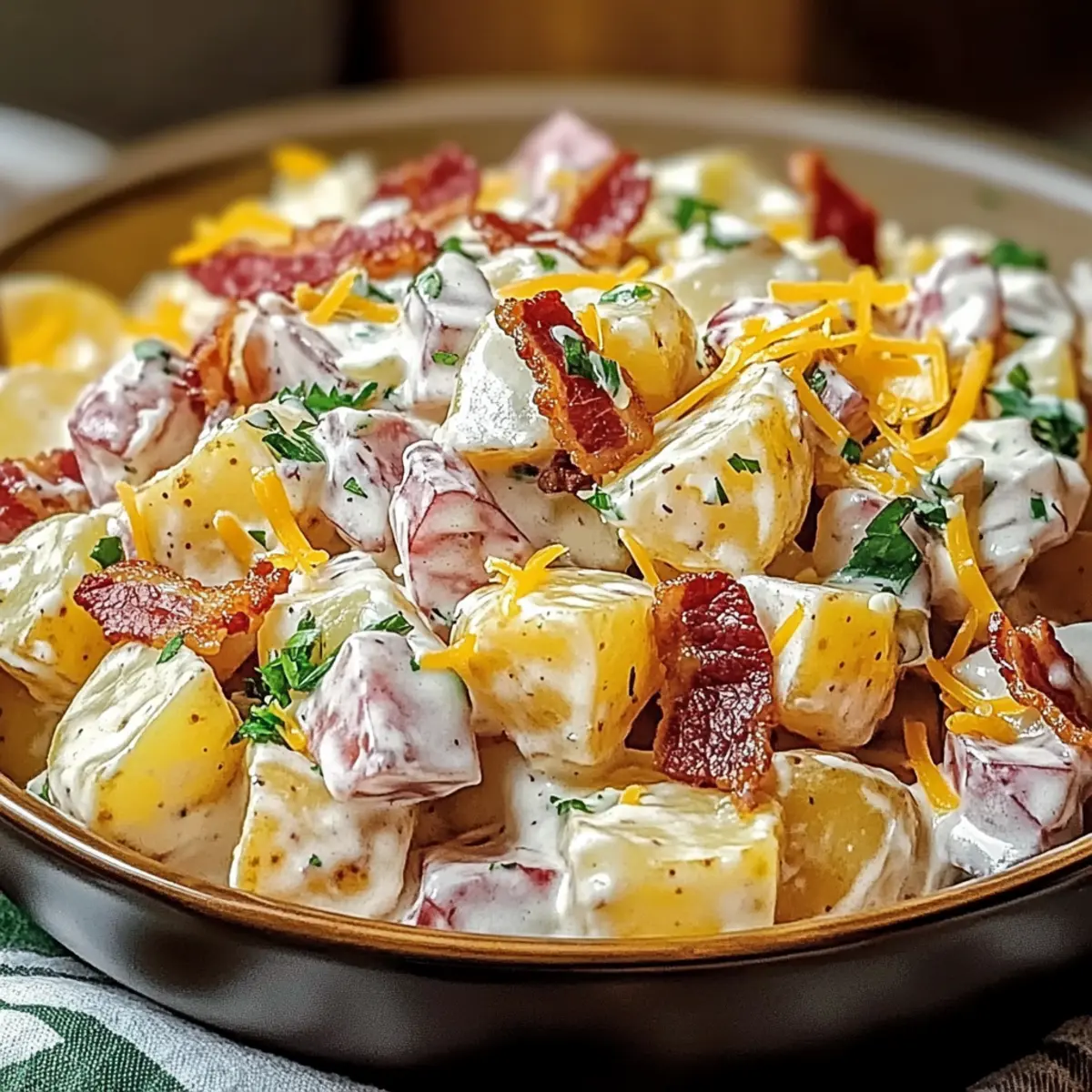 - Combine cooled diced potatoes with bacon, cheddar, pickles, and herbs in a large bowl. Fold in dressing gently.