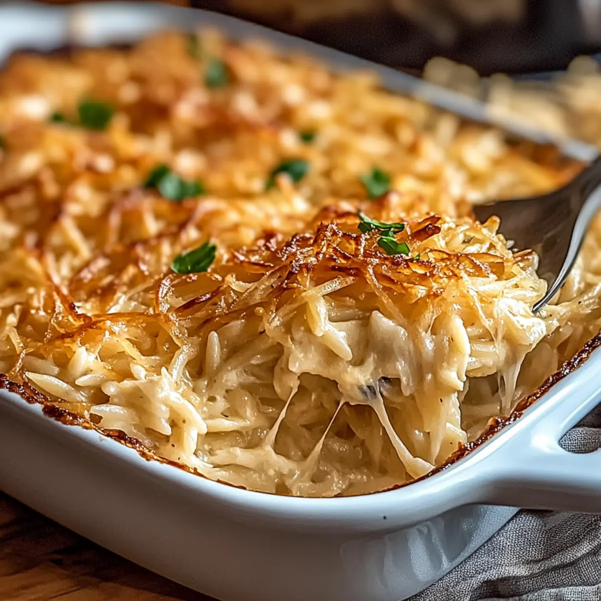 After baking, allow the dish to cool for a few minutes. For a final touch, sprinkle freshly chopped parsley or chives over the top, adding both flavor and visual appeal. Serve your Creamy French Onion Orzo Bake warm, and savor the delightful layers of flavor and creamy texture!