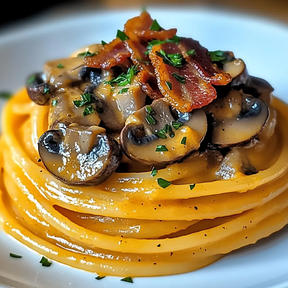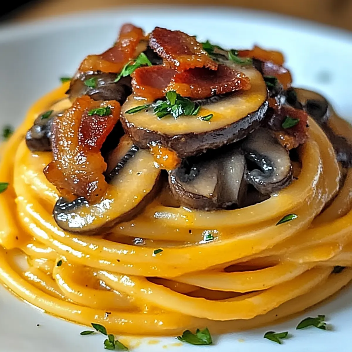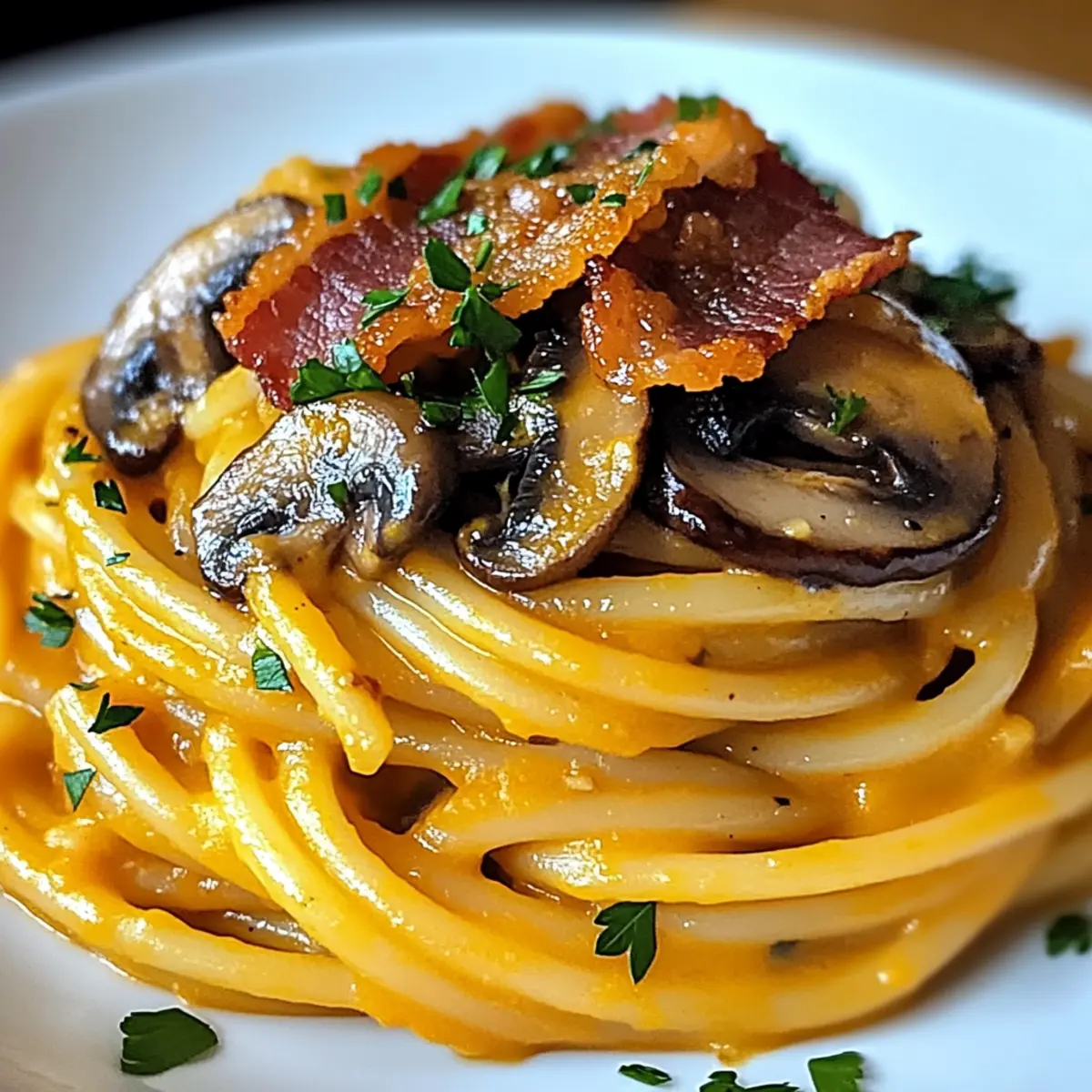 Creamy Pumpkin & Mushroom Spaghetti with Crispy Bacon Bliss