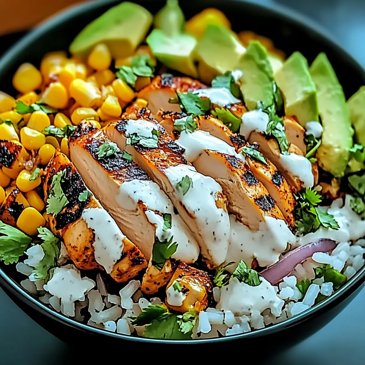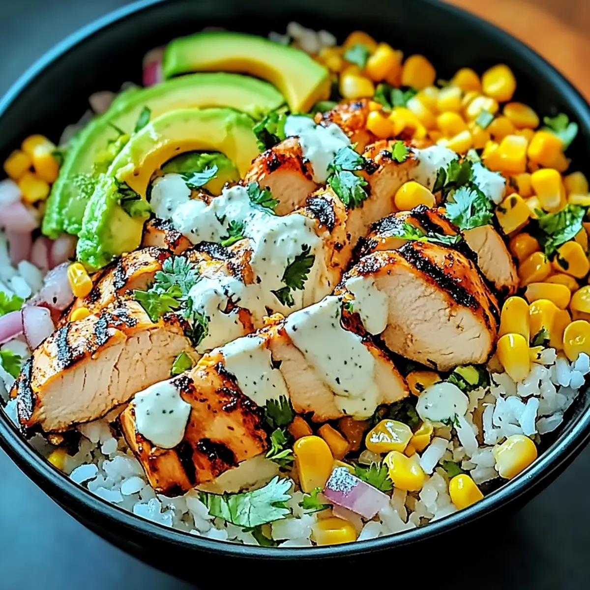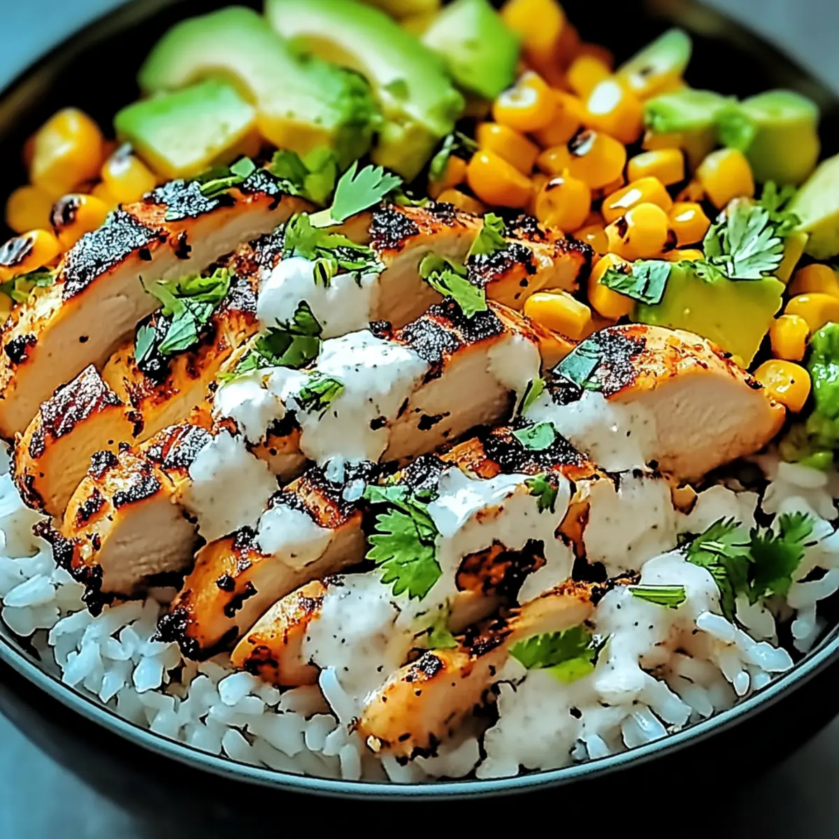 Divide the flavorful rice and corn mixture into serving bowls. Top each bowl with sliced grilled chicken, creamy avocado, and a sprinkle of Cotija or feta cheese. Garnish with fresh cilantro for an extra pop of flavor and color. Each bowl is a feast for the eyes and the palate, making your Easy Street Corn Chicken Rice Bowl truly delightful.