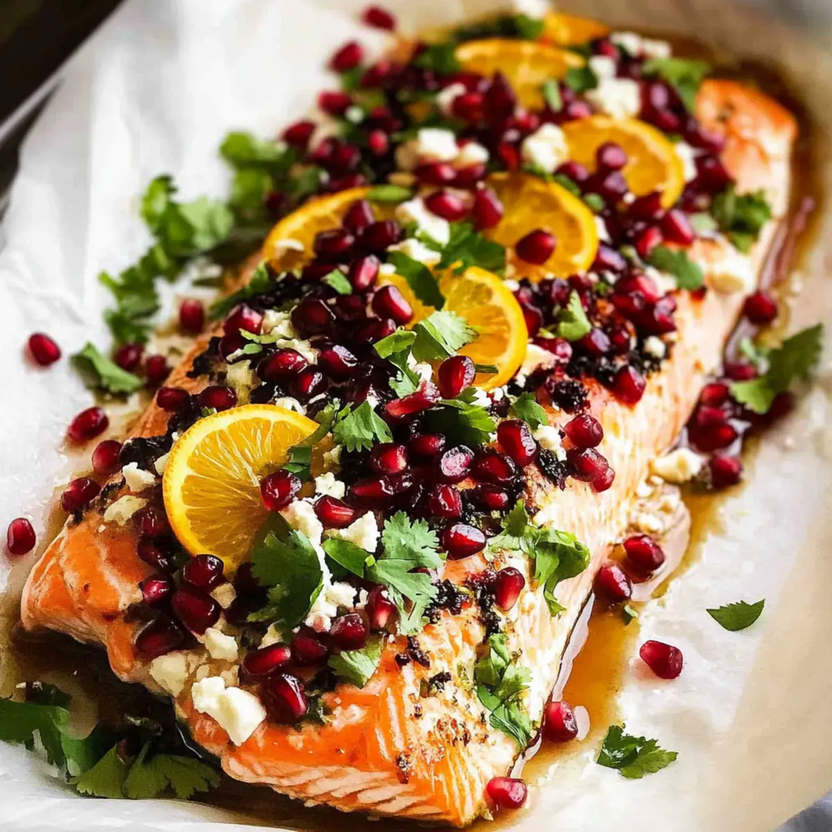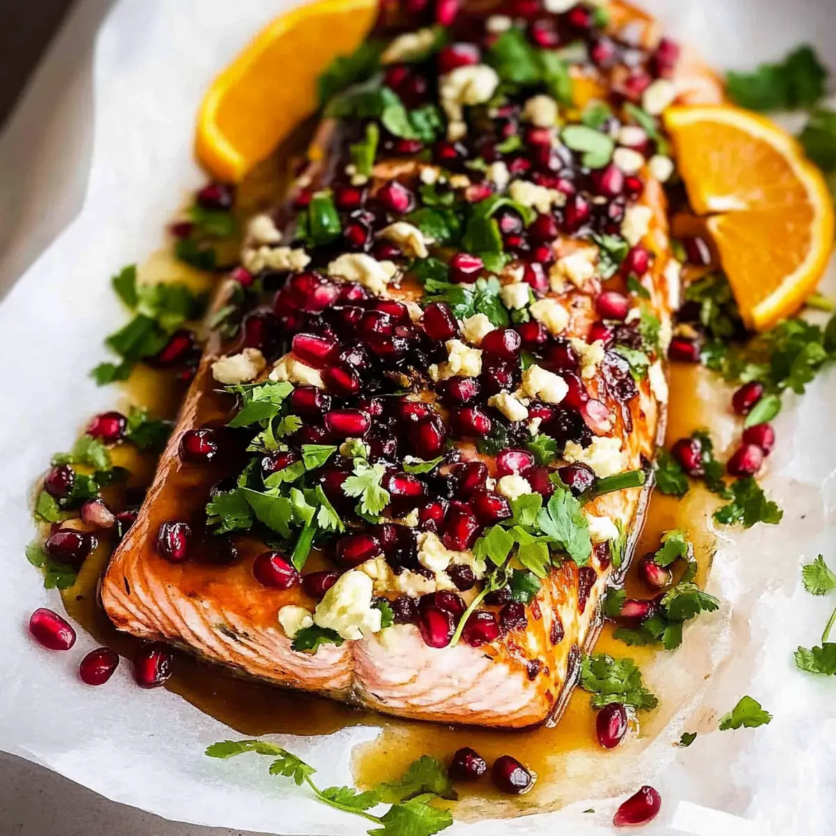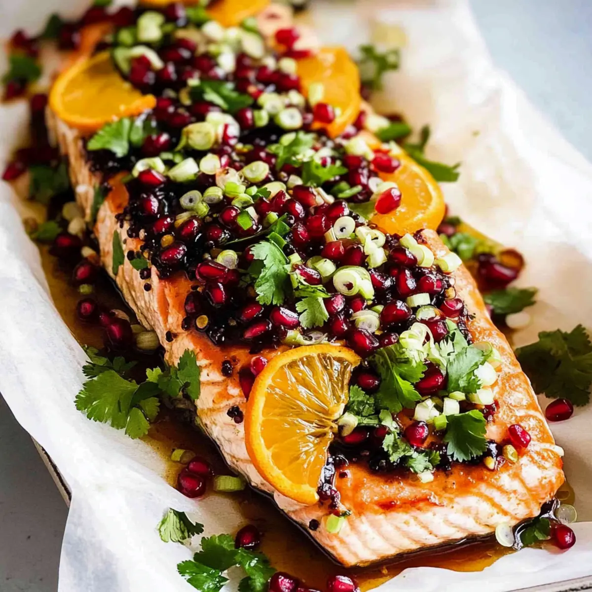 Festive Flavors: The sweet-tangy glaze of pomegranate and citrus elevates this salmon to a holiday masterpiece.