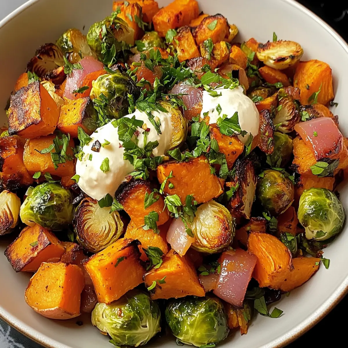 Colorful and Nutritious: The vibrant hues of sweet potatoes and Brussels sprouts bring not only beauty but a wealth of vitamins to your plate.