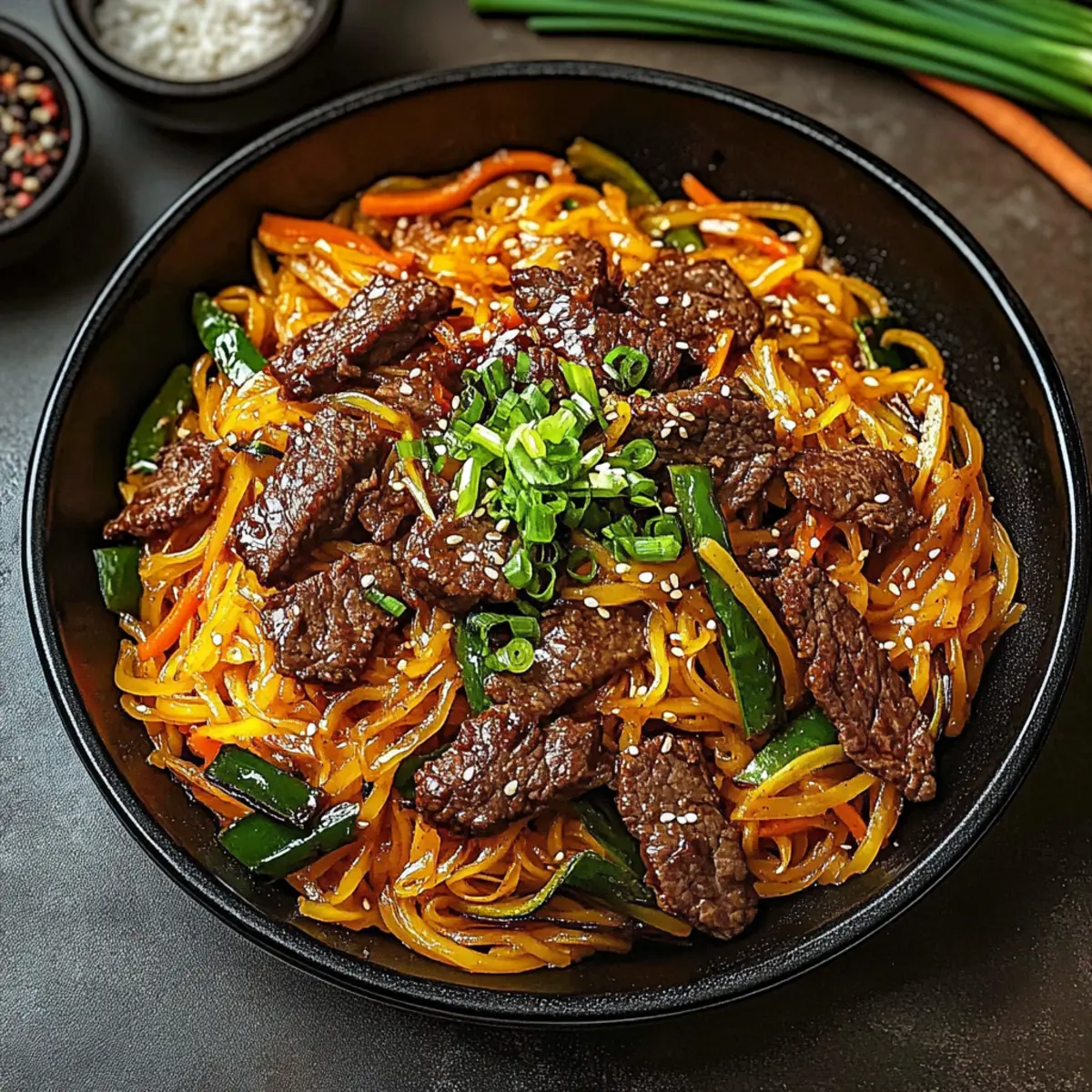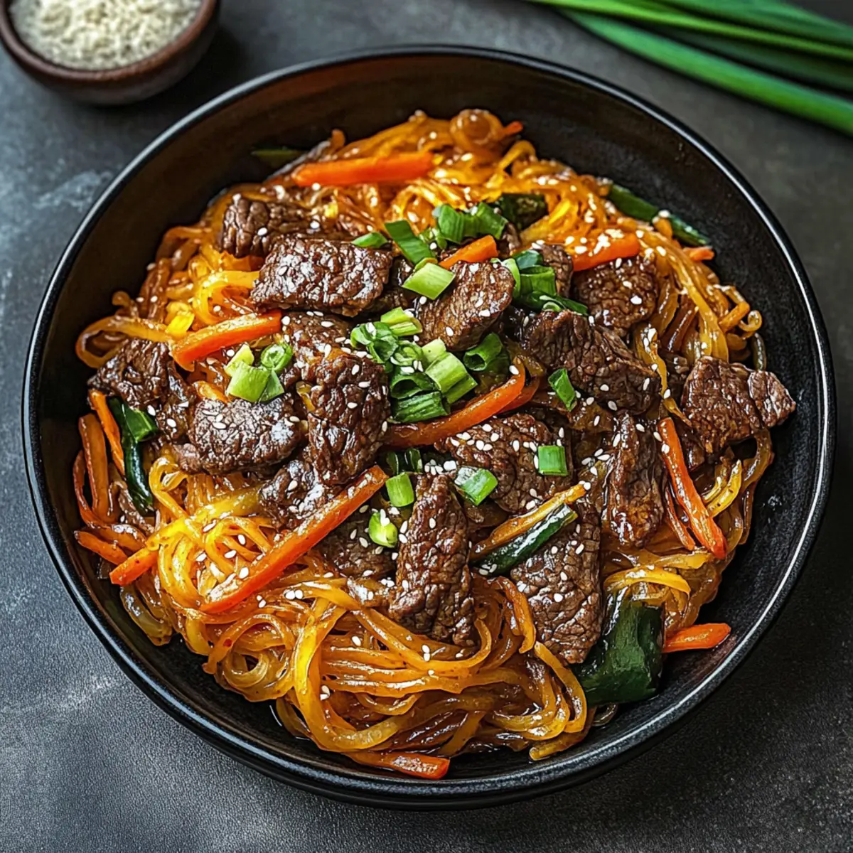 • Sweet Potato Glass Noodles – The heart of Japchae; they provide a distinctive chewy texture.