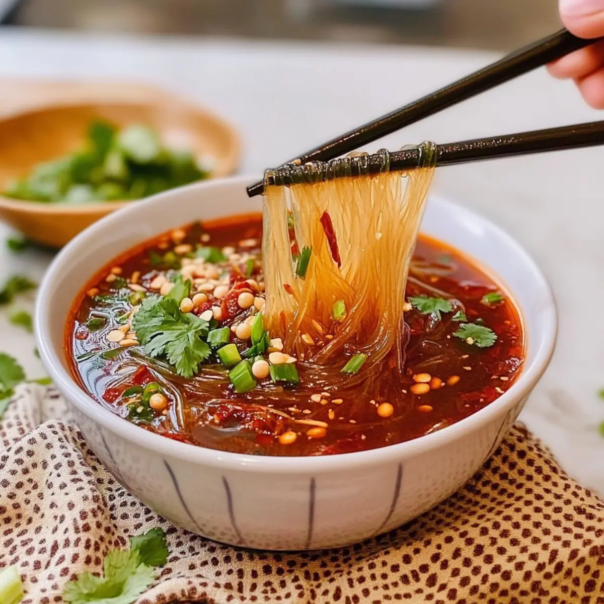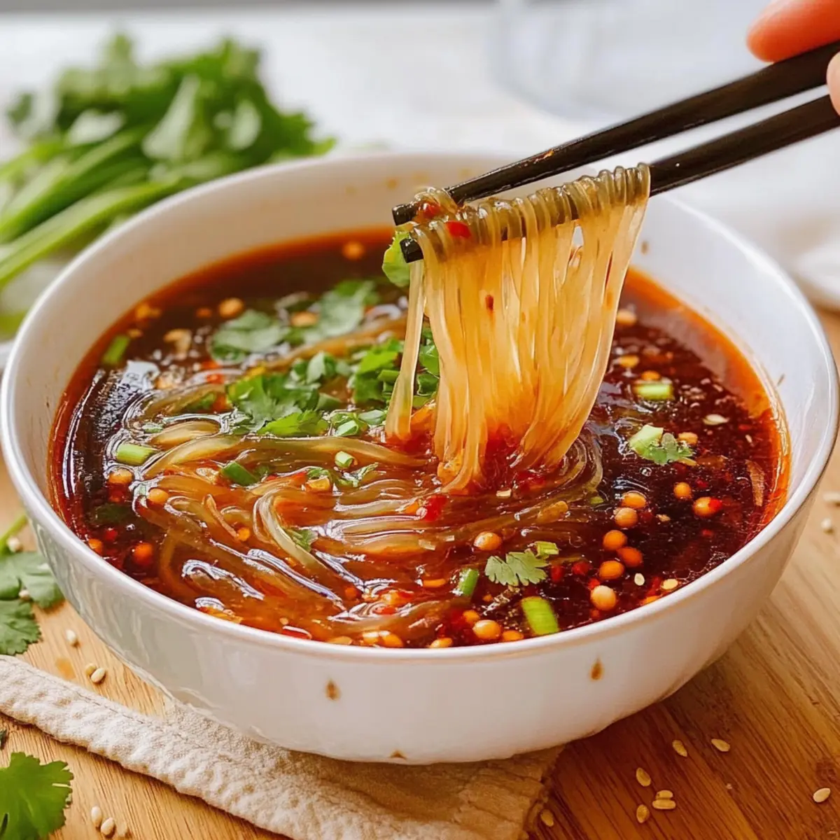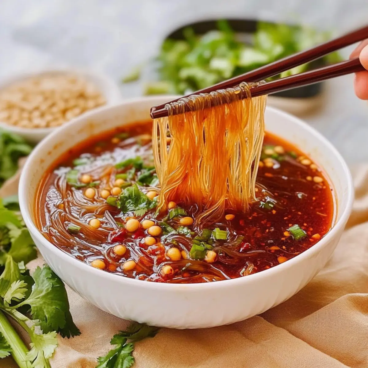 Dive into this delightful recipe for Chongqing Hot and Sour Glass Noodle Soup and savor each addictive slurp!