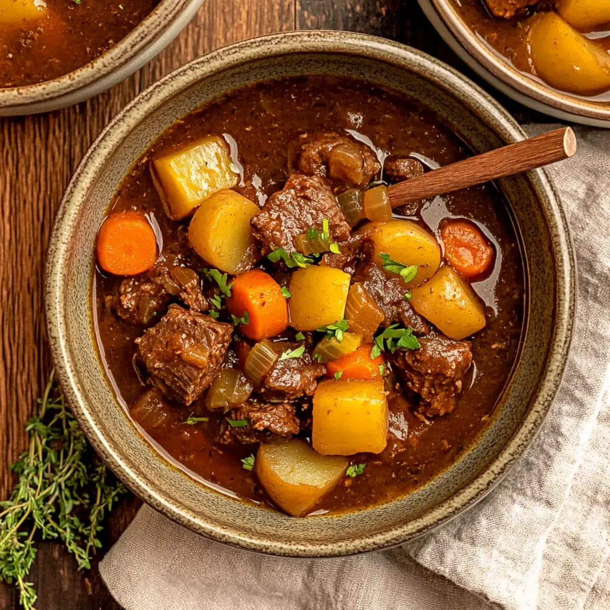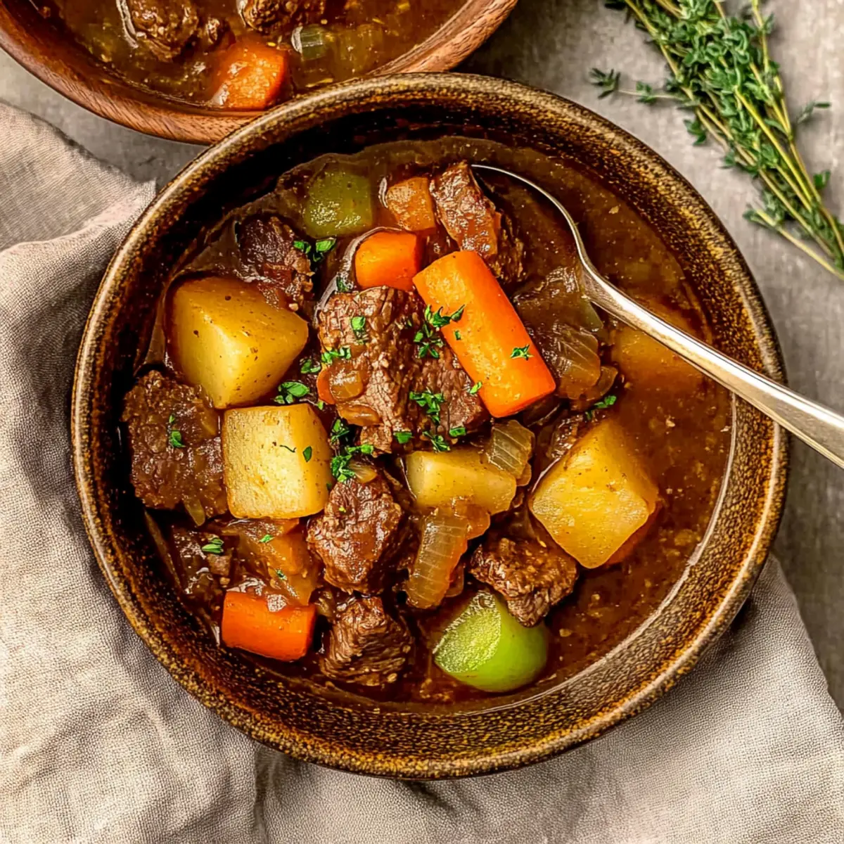 • Fresh Thyme (2 sprigs), Fresh Rosemary (1 sprig) – Herbs that infuse the stew with fragrant notes.
