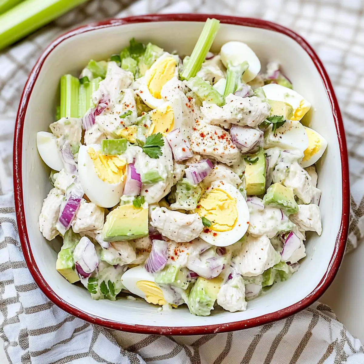 2. In a large mixing bowl, combine diced chicken, avocado, chopped celery, and red onion. Fold in the chopped hard-boiled eggs gently.