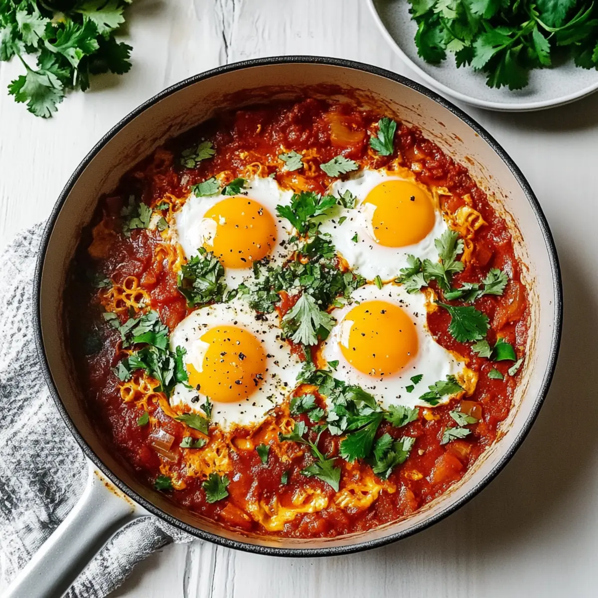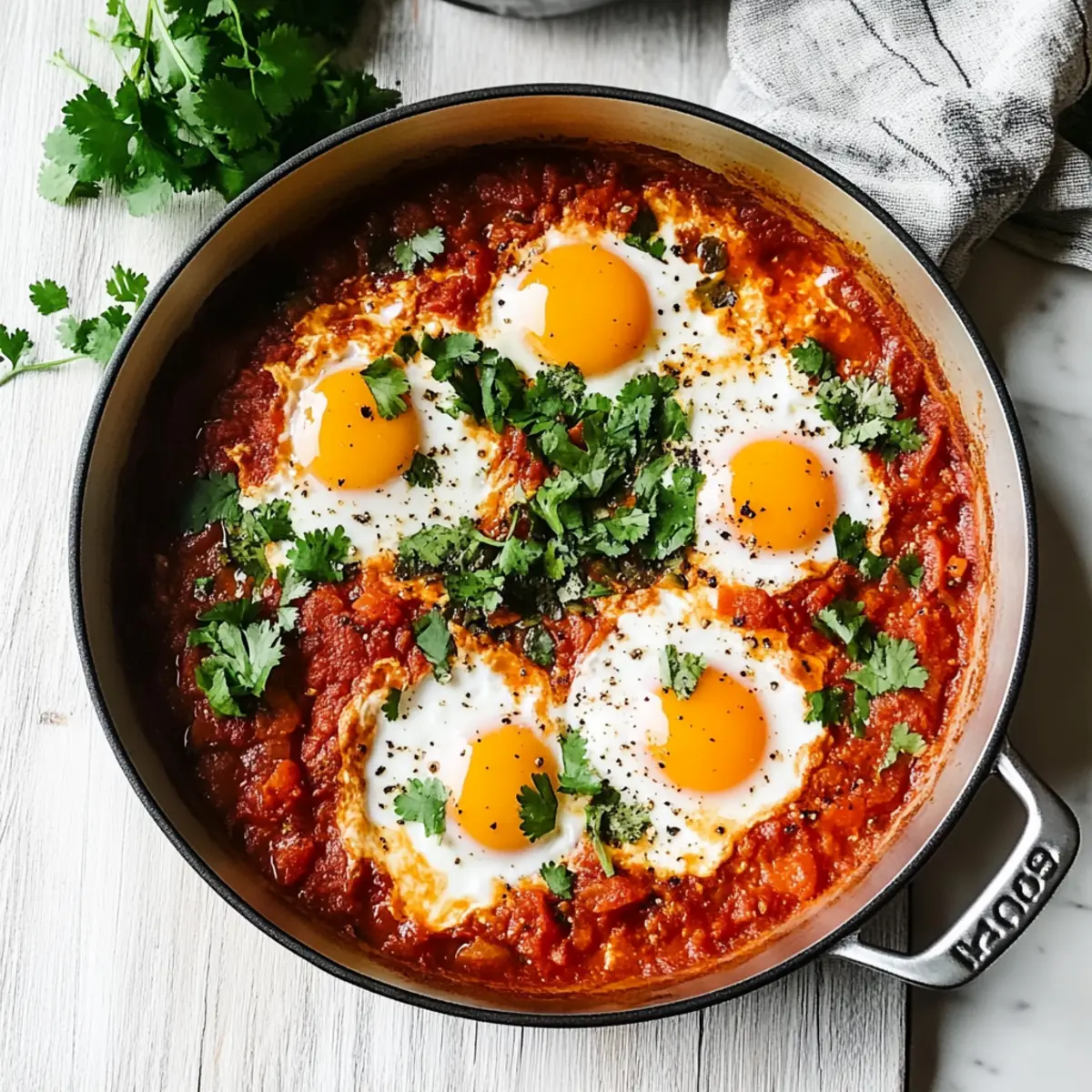Once the eggs are cooked to your liking, remove the pan from heat and garnish your shakshuka with freshly chopped cilantro and parsley. The vibrant herbs not only add a pop of color but also enhance the dish’s flavors. Now, you’re ready to serve this beautiful shakshuka straight from the pan!