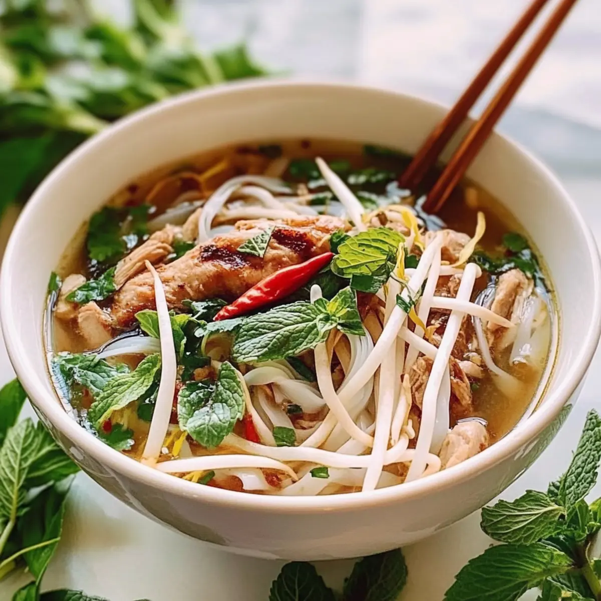 Top each bowl of broth and noodles with the seared chicken slices. Then, add a generous handful of fresh bean sprouts and a sprinkle of mint, cilantro, and Thai basil for a burst of herbaceous flavor. The colors and aromas will invite you to dig in!