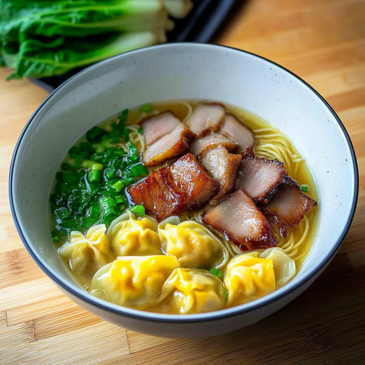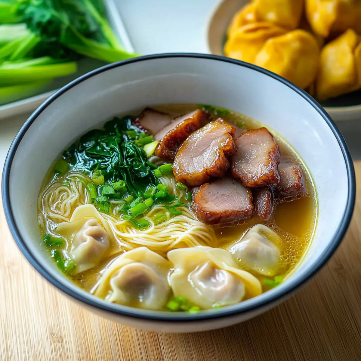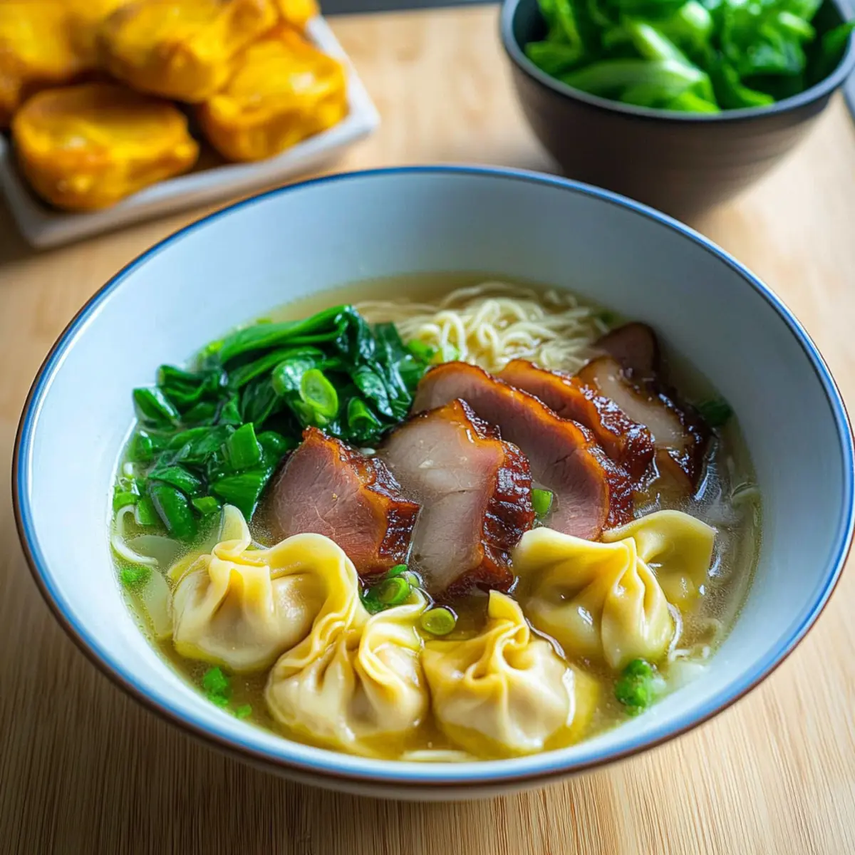 - To serve, place a generous portion of wonton noodles in each bowl, followed by the cooked wontons and blanched bok choy. Carefully ladle the hot broth over the noodles and ingredients, ensuring everyone gets a taste of that aromatic liquid. Top each bowl with sliced Char Siu, a drizzle of garlic oil, minced scallions, and season with white pepper, chili vinegar, and a splash of fish sauce to suit your taste.