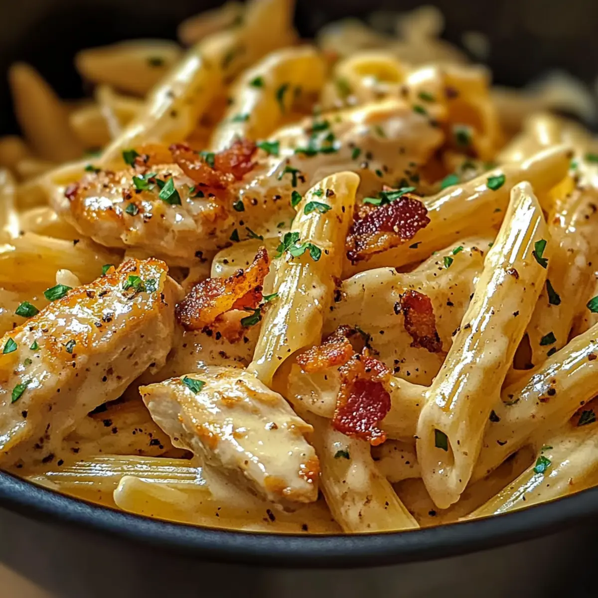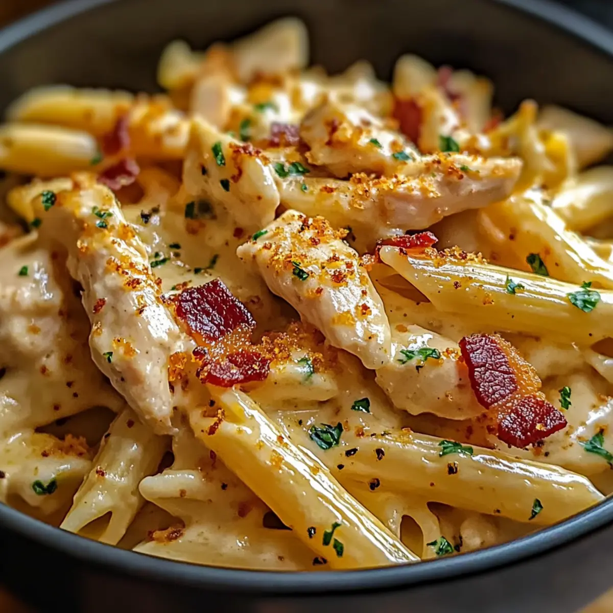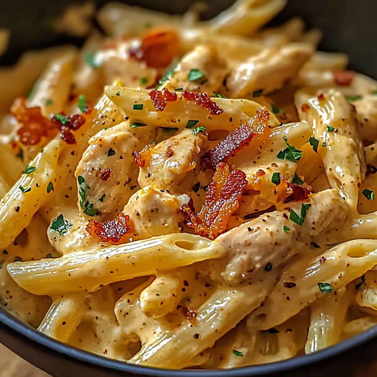 - Once the Crack Chicken Penne is warm and well-combined, serve it immediately. Garnish with the crispy bacon pieces you set aside earlier, and feel free to add fresh herbs like parsley or chives for a pop of color. Enjoy your comforting bowl of deliciousness!