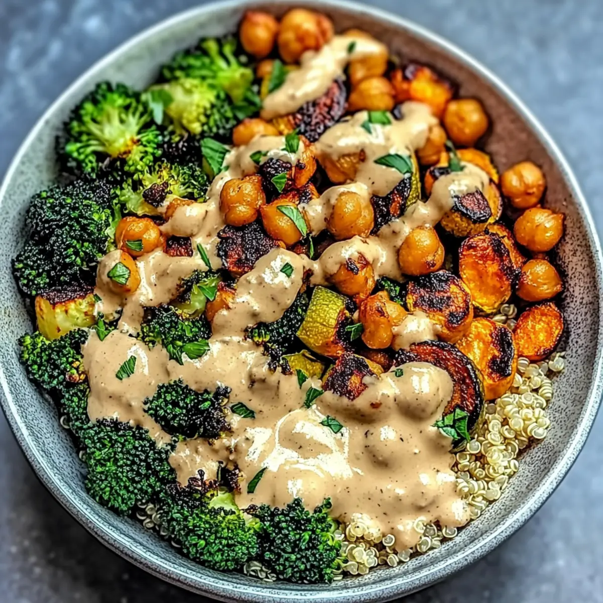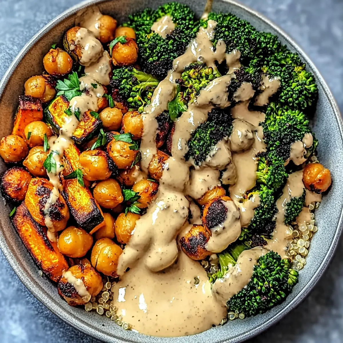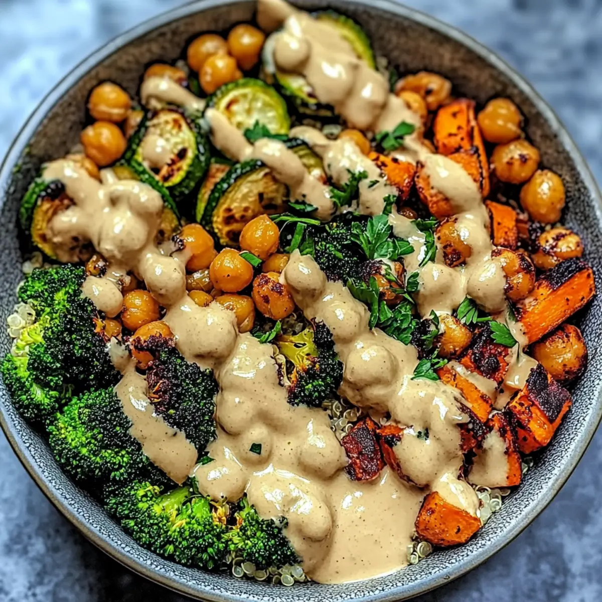 A wholesome embrace of tender roasted veggies and crunchy chickpeas, drizzled with a silky Maple Dijon Tahini Dressing.