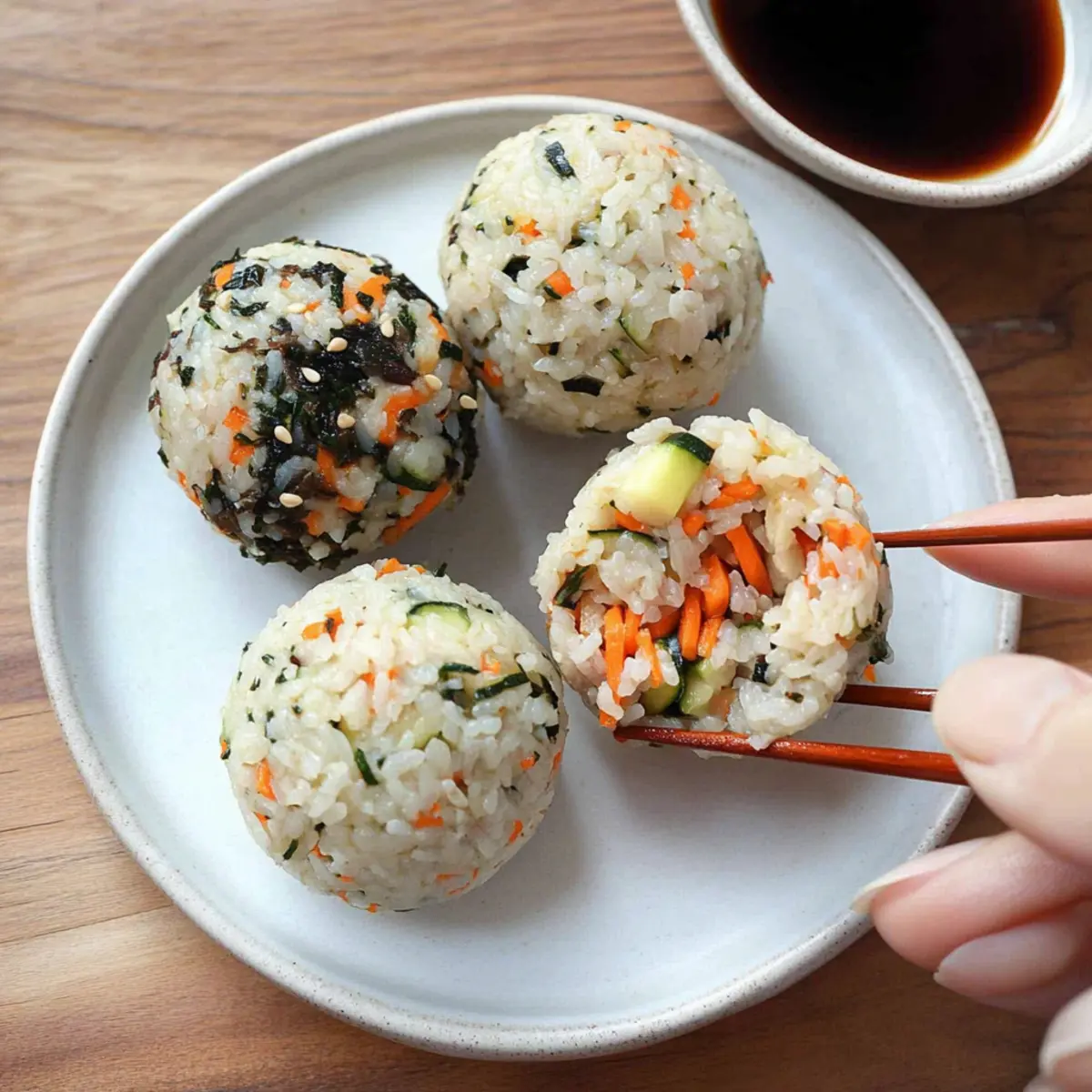 Crispy Tempura Vegetables: Light and airy, these crispy bites add a crunchy contrast to the soft rice balls, enhancing every scoop.