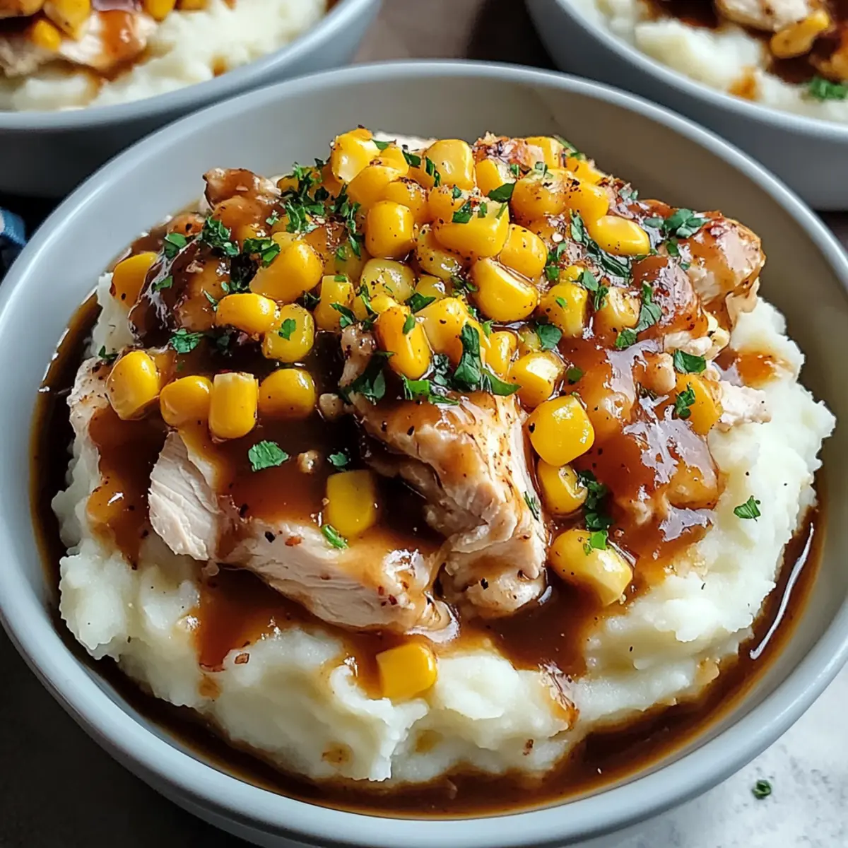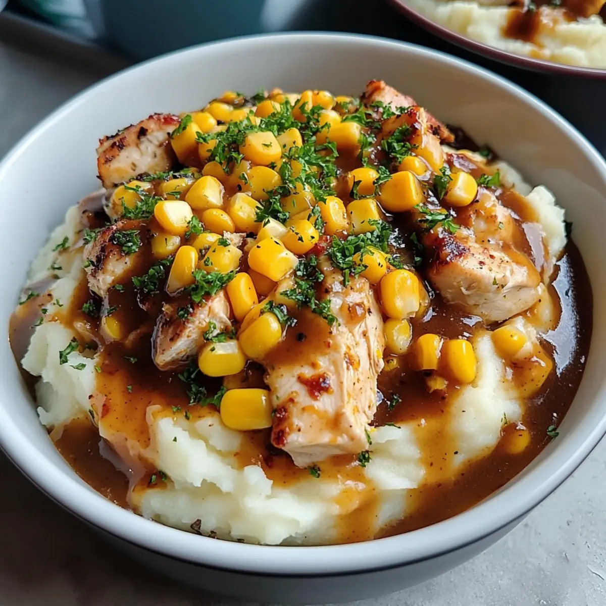 - To assemble, scoop mashed potatoes into bowls, then layer on warmed corn and sautéed chicken.