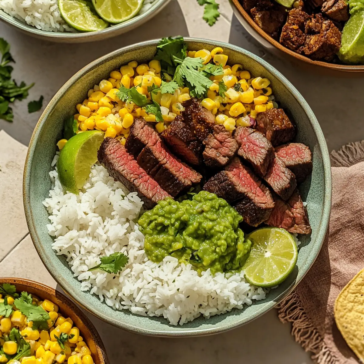 - Layer rice, sliced steak, corn salsa, guacamole, and desired toppings in each bowl to serve.