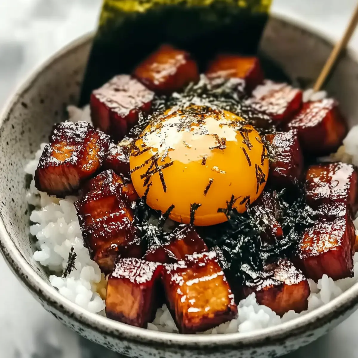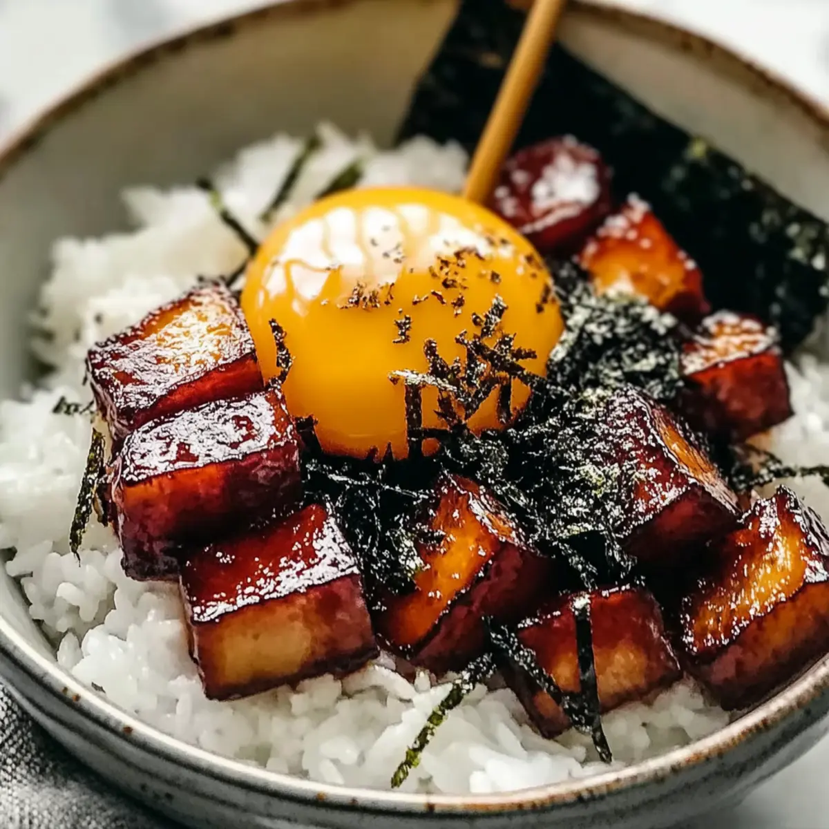 In a serving bowl, start with a generous scoop of fluffy rice as the base. Sprinkle a layer of furikake seasoning on top, then add crispy nori strips for added texture. Next, place the glazed Spam right on top of the rice, followed by your beautifully cooked eggs. Drizzle the remaining glaze over everything for a final burst of flavor.