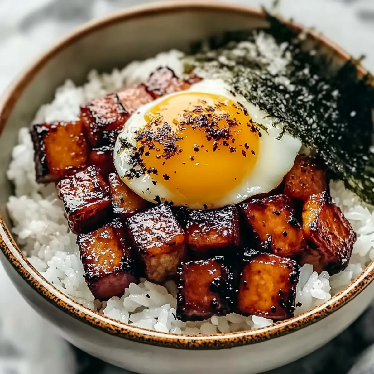 - Assemble Bowls: Add rice, sprinkle furikake, layer with nori strips, glazed Spam, and eggs.