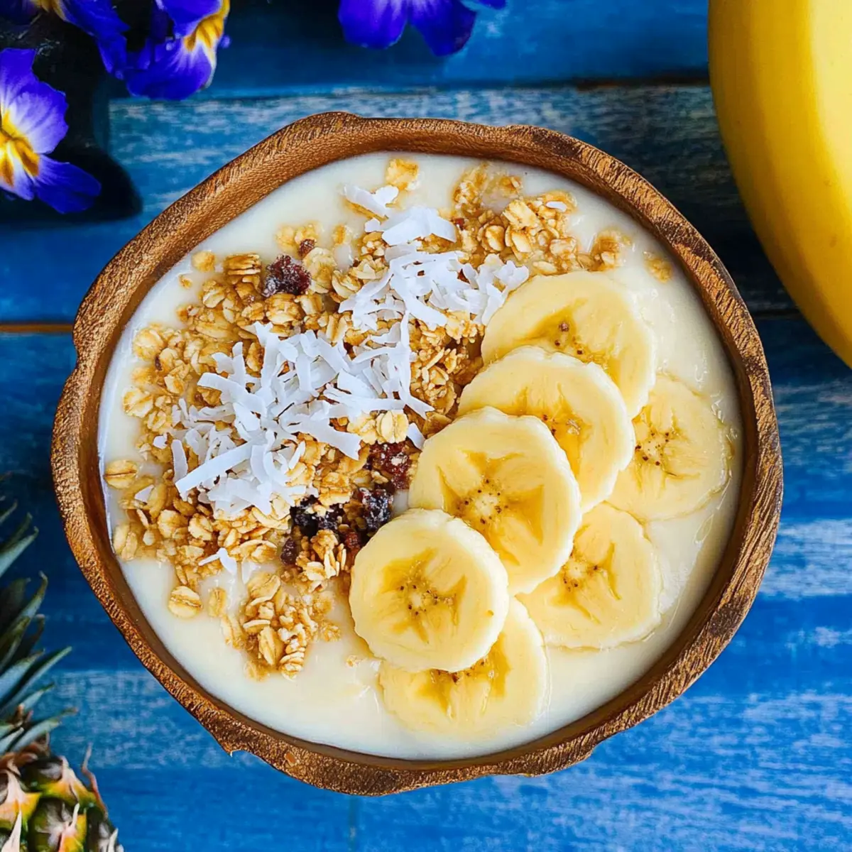 4. Add Toppings: Top your smoothie bowl with sliced banana, pineapple chunks, granola, and shredded coconut.