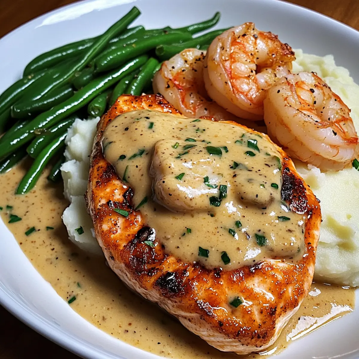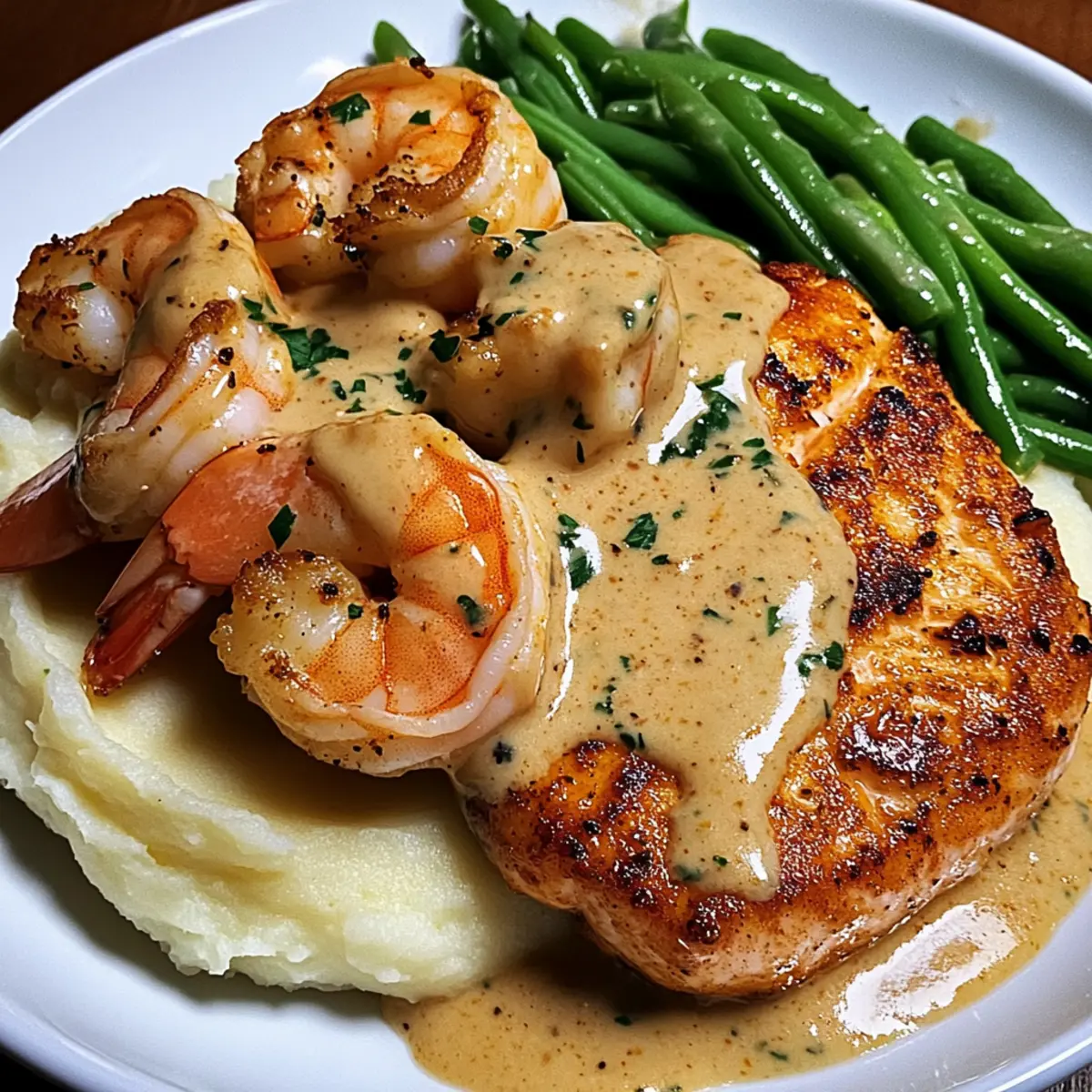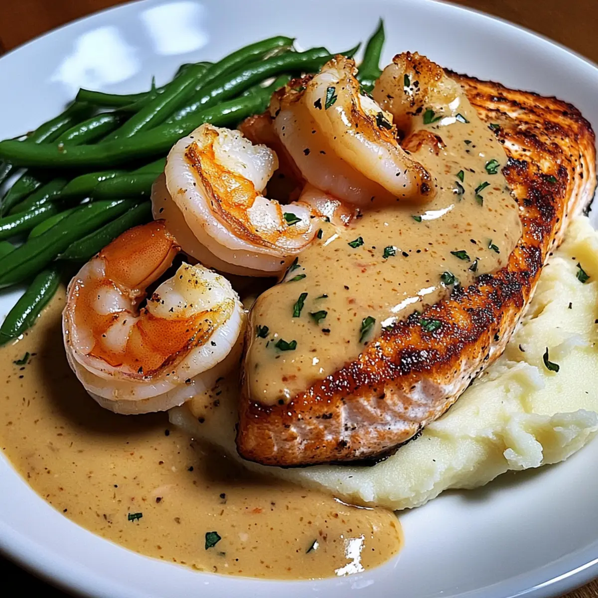 - To serve, create a base of creamy mashed potatoes, layer sautéed green beans, crispy salmon, and succulent shrimp, then drizzle with garlic cream sauce.