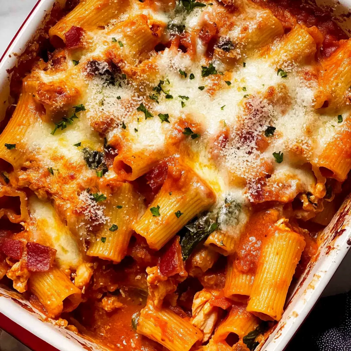 As I stood in my kitchen, the enticing aroma of sizzling bacon danced through the air, bringing me back to family dinners filled with laughter and warmth. This Hearty Chicken Pasta Bake with Tomato Sauce is more than just a meal; it’s a comforting hug on a plate, combining tender chicken, savory bacon, and juicy tomatoes. As you layer gooey mozzarella and parmesan on top, you’ll see why this dish effortlessly becomes a family favorite. Plus, it’s a fantastic make-ahead meal, perfect for busy weeknights, and there’s no need for additional sides—it’s all included in one delicious dish. Ready to create a cozy feast that satisfies everyone at the table? Let’s dive into this delightful recipe that’s sure to become your new go-to!