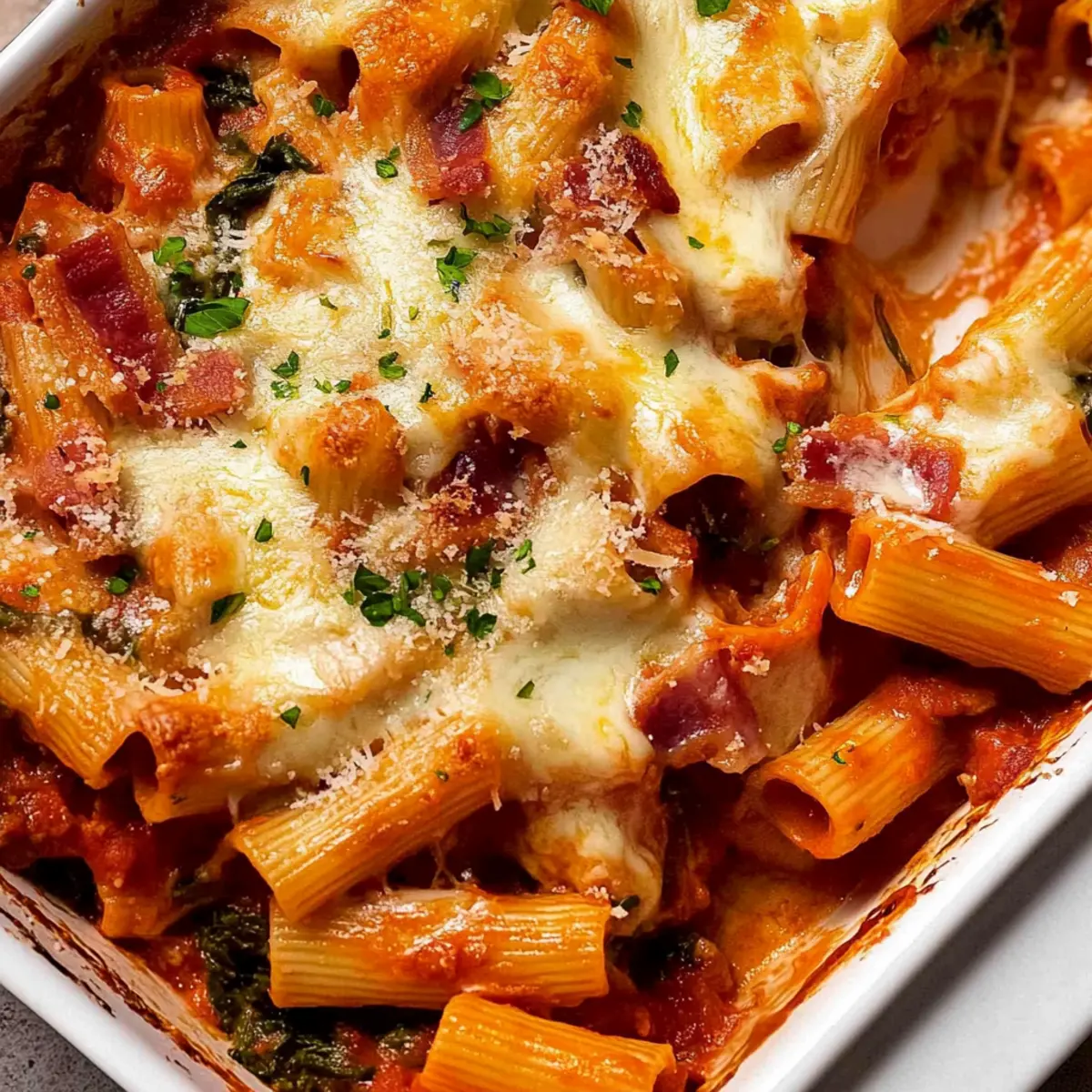 Once your sauce is nicely simmered, return the cooked chicken to the skillet along with the reserved juices. Add the cooked rigatoni, crispy bacon, fresh spinach, and diced tomatoes. Gently mix everything together until well coated in the delicious sauce, ensuring every bit of pasta is embraced by that mouth-watering Chicken Pasta Bake flavor.