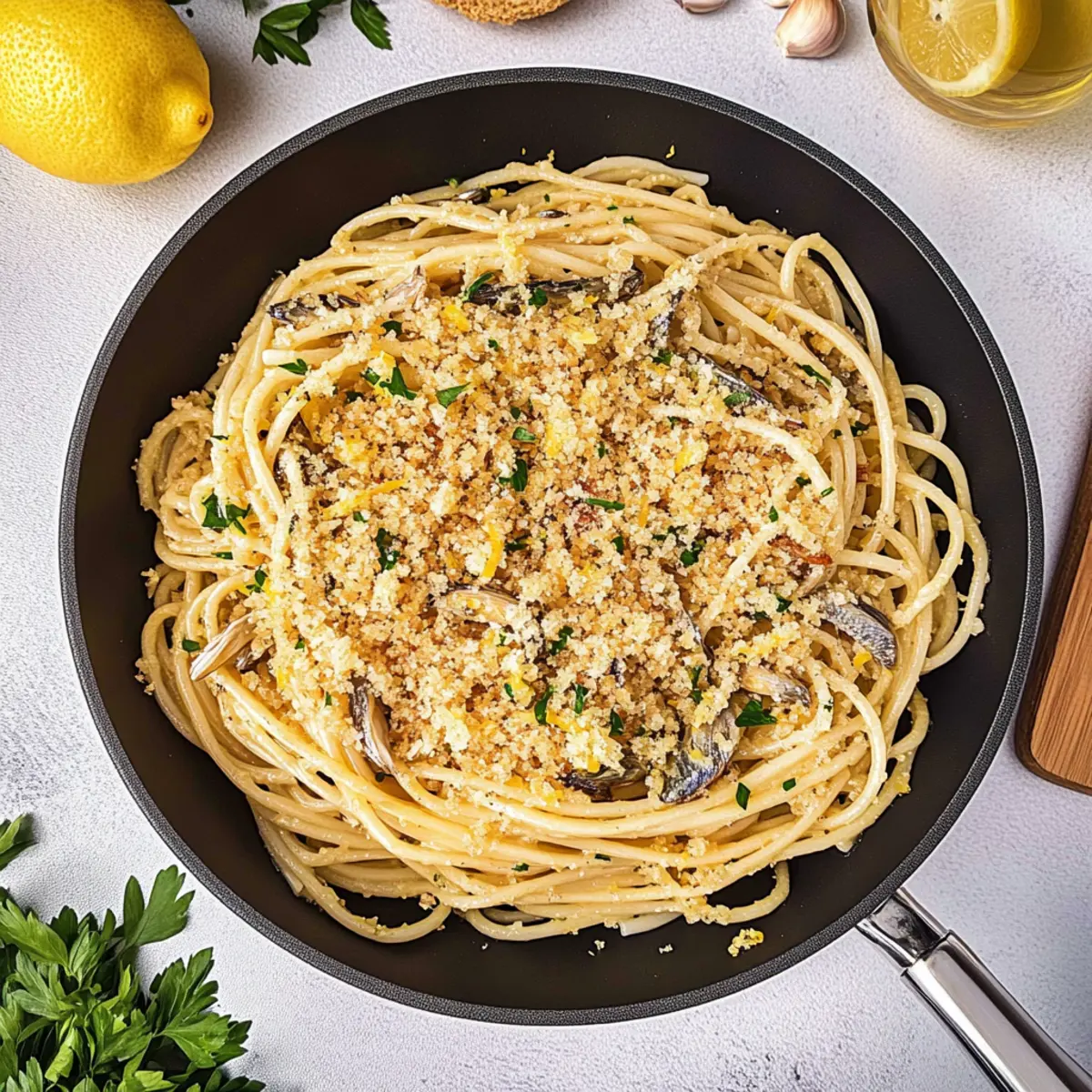 Finally, add the toasted breadcrumbs to the pasta mix and toss once more to combine. Plate your servings of sardine pasta with lemon and garlic crumbs, garnishing with fresh parsley and lemon wedges for a bright finish. A sprinkle of black pepper will enhance the flavors beautifully as you serve.