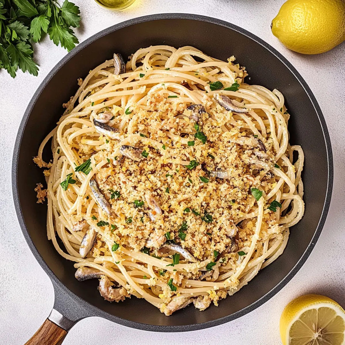 - Add toasted breadcrumbs to the pasta mix, toss to combine, and serve garnished with parsley and lemon wedges.