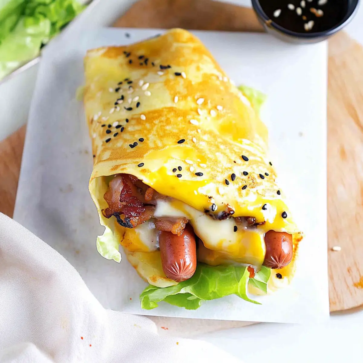 Absolutely! When choosing your ingredients, opt for fresh eggs, which have a richer flavor. If you’re using bacon, look for thick-cut slices for the best crispiness. For the crepe batter, all-purpose flour is ideal, but if you’re feeling adventurous, try whole wheat or gluten-free options. Always check the expiration dates on any packaged items like hot dog sausages, and pick fresh produce like crisp lettuce and vibrant coriander to enhance your dish.