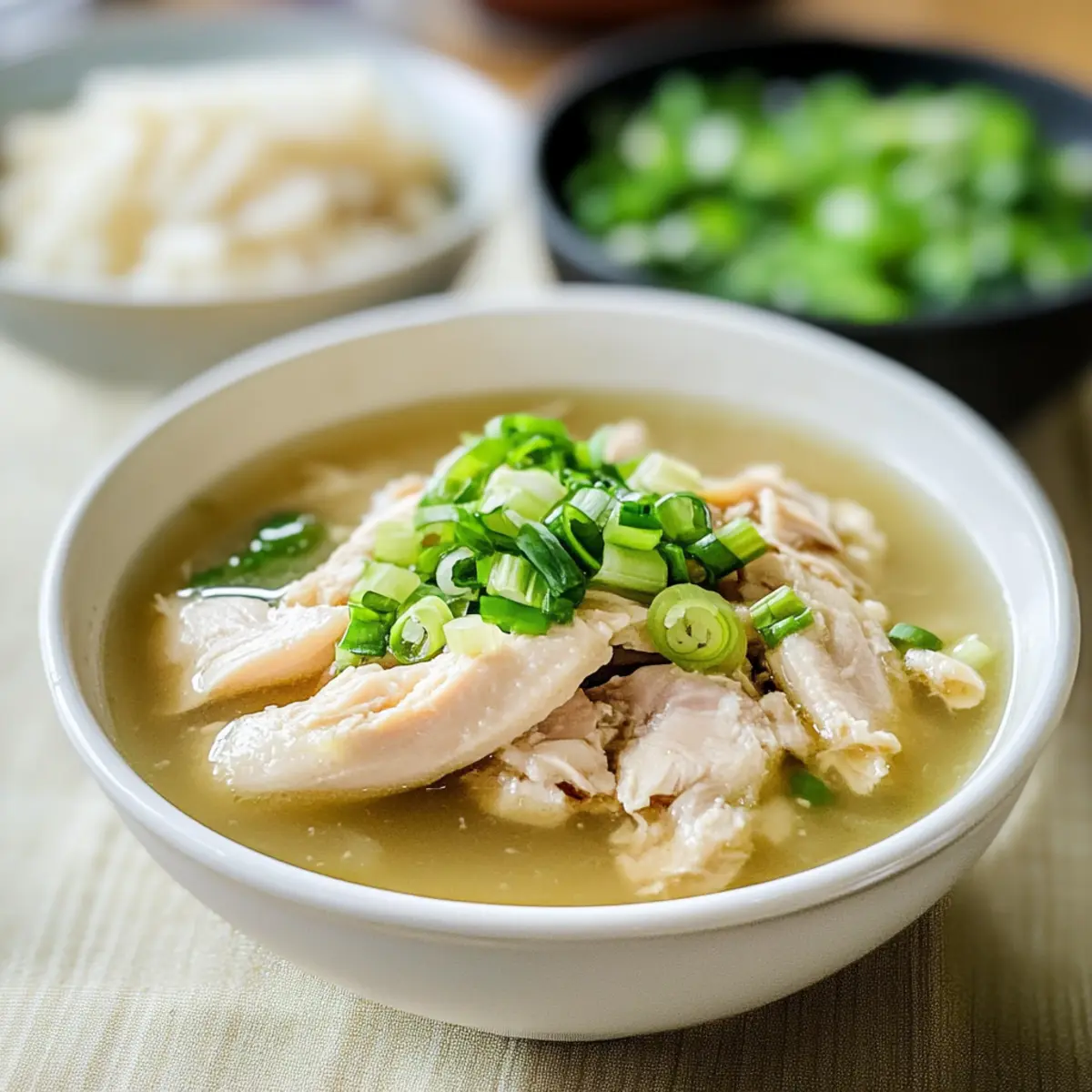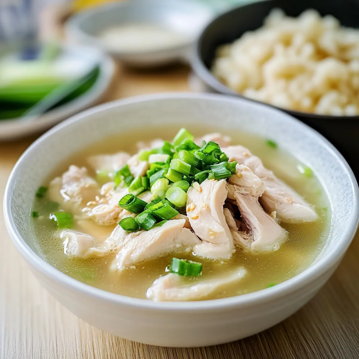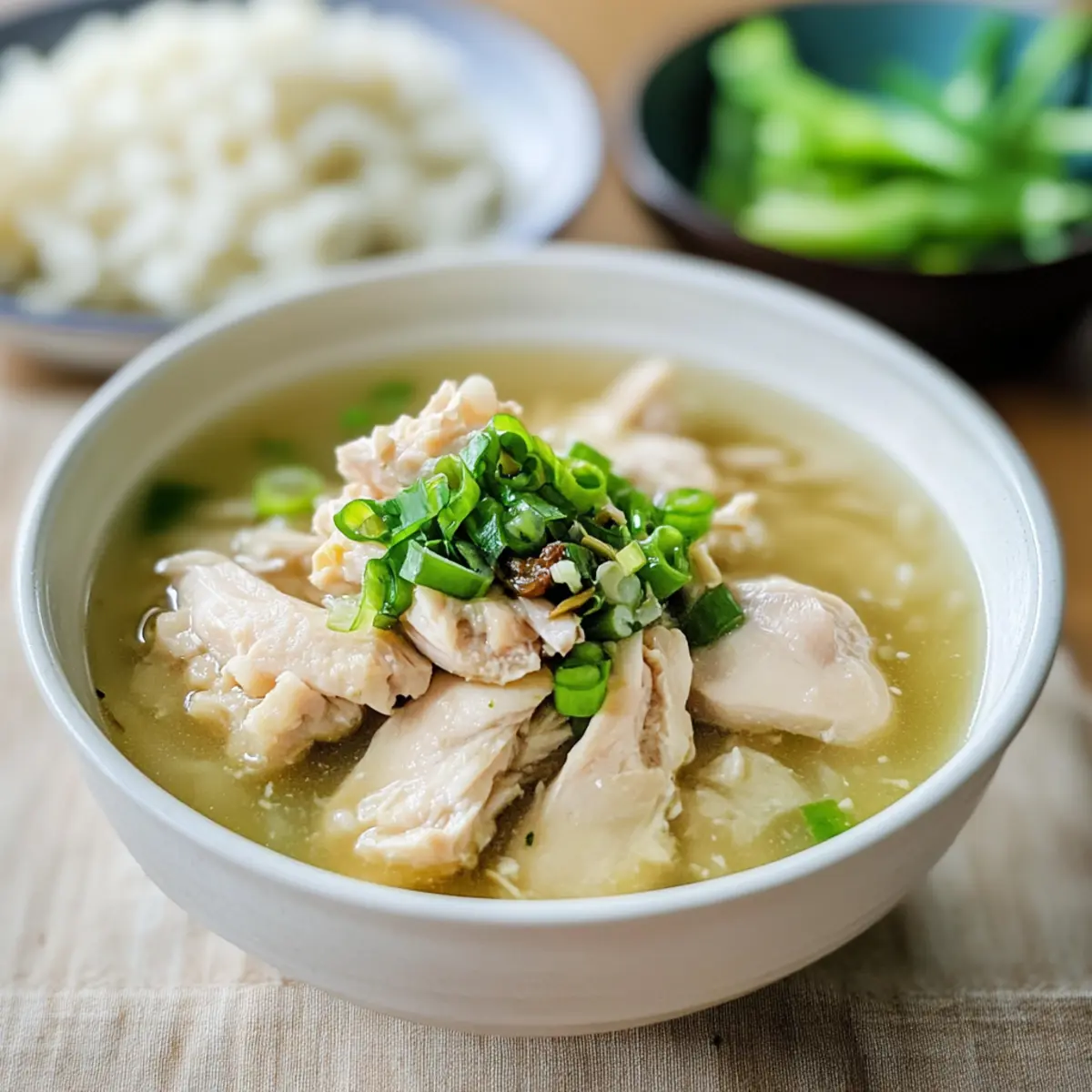 To serve, place a scoop of rice in each bowl and top with some of the shredded chicken. Ladle the hot, fragrant broth over the chicken and rice until everything is generously submerged. For an extra touch, garnish with finely chopped green parts of the scallions and season with salt to taste. Optional spicy sauce can add flavor if desired.