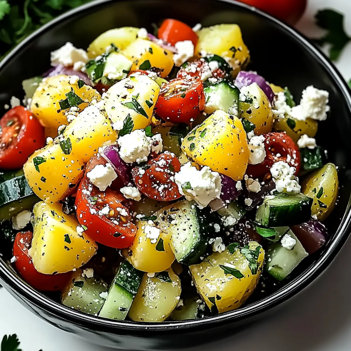 - Add parsley, red onion, cucumber, tomatoes, olives, and feta to the potatoes. Toss gently.