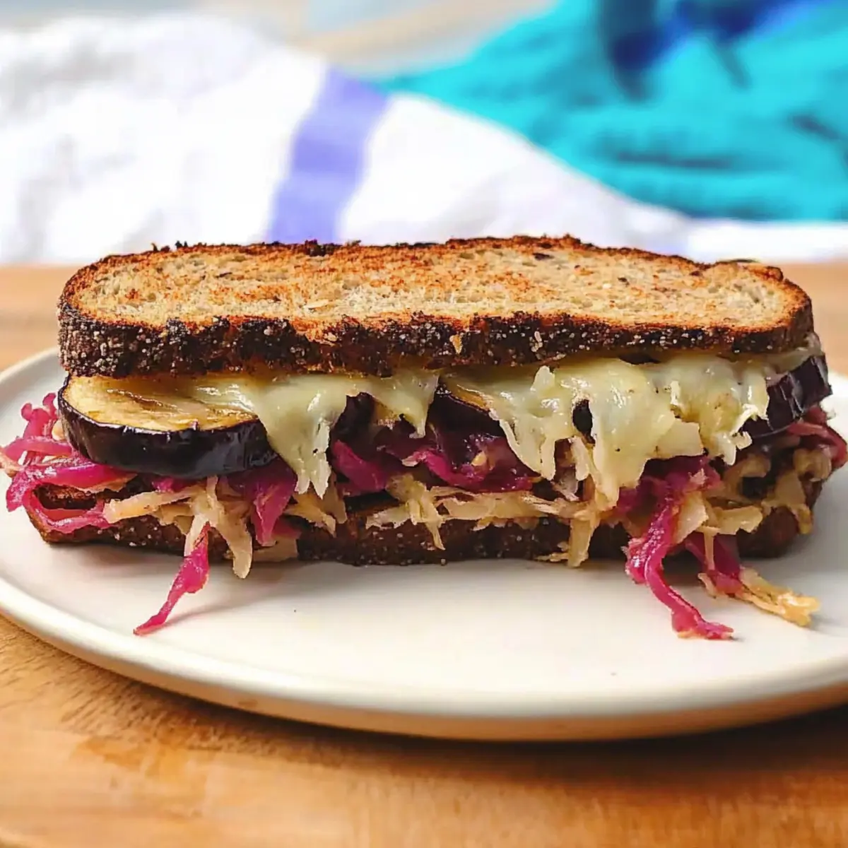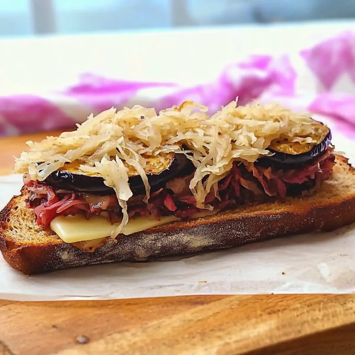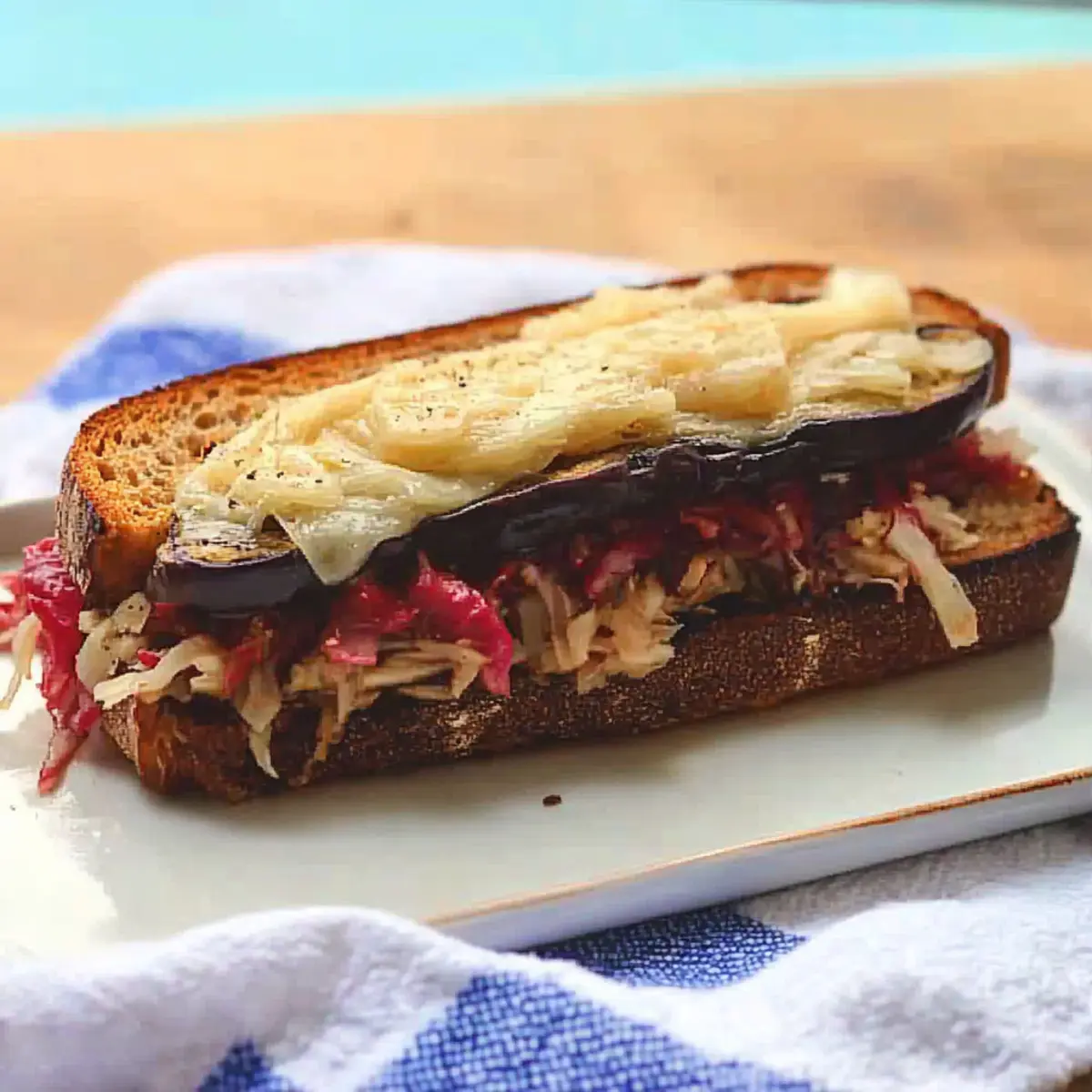 Flavor Explosion: Each bite of this sandwich delivers a symphony of tastes, with marinated aubergine and tangy sauerkraut harmonizing beautifully with creamy Swiss cheese.